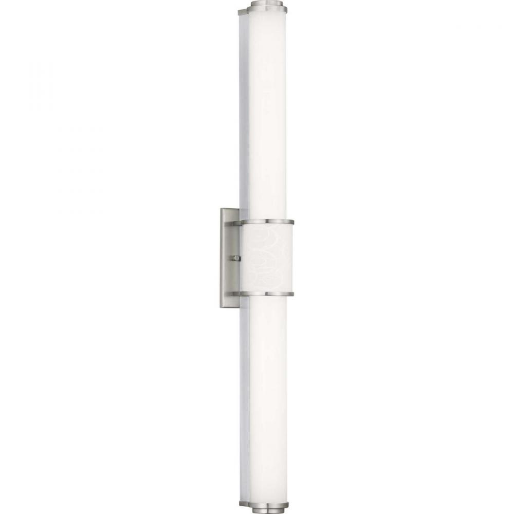 Ideal for a bathroom;Perfect for modern style settings;Beautiful brushed nickel finish;Crisp white acrylic shade;Fixture can mount horizontal and vertical;Includes 1 integrated LED (33 W), 2475 lumens, 3000 K, 90 CRI, dimmable;Measures 36-inch width by 4.