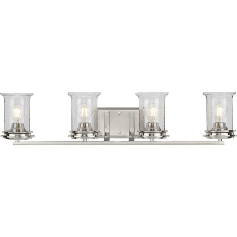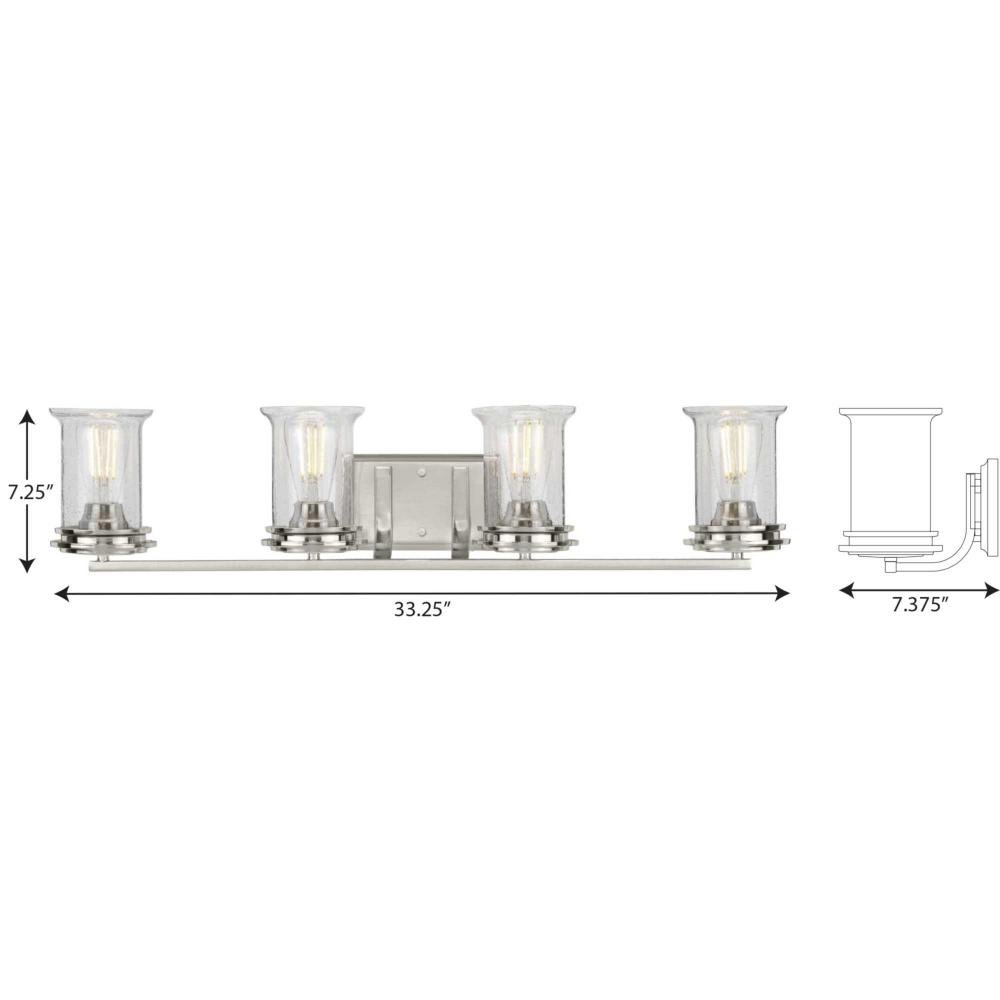 Ideal for a bathroom;Perfect for coastal, farmhouse, rustic, and transitional style settings;Beautiful brushed nickel finish;Rustic clear seeded glass shades;Mount the light fixture facing up or down;Use 4 medium base bulbs that are sold separately (60 W m