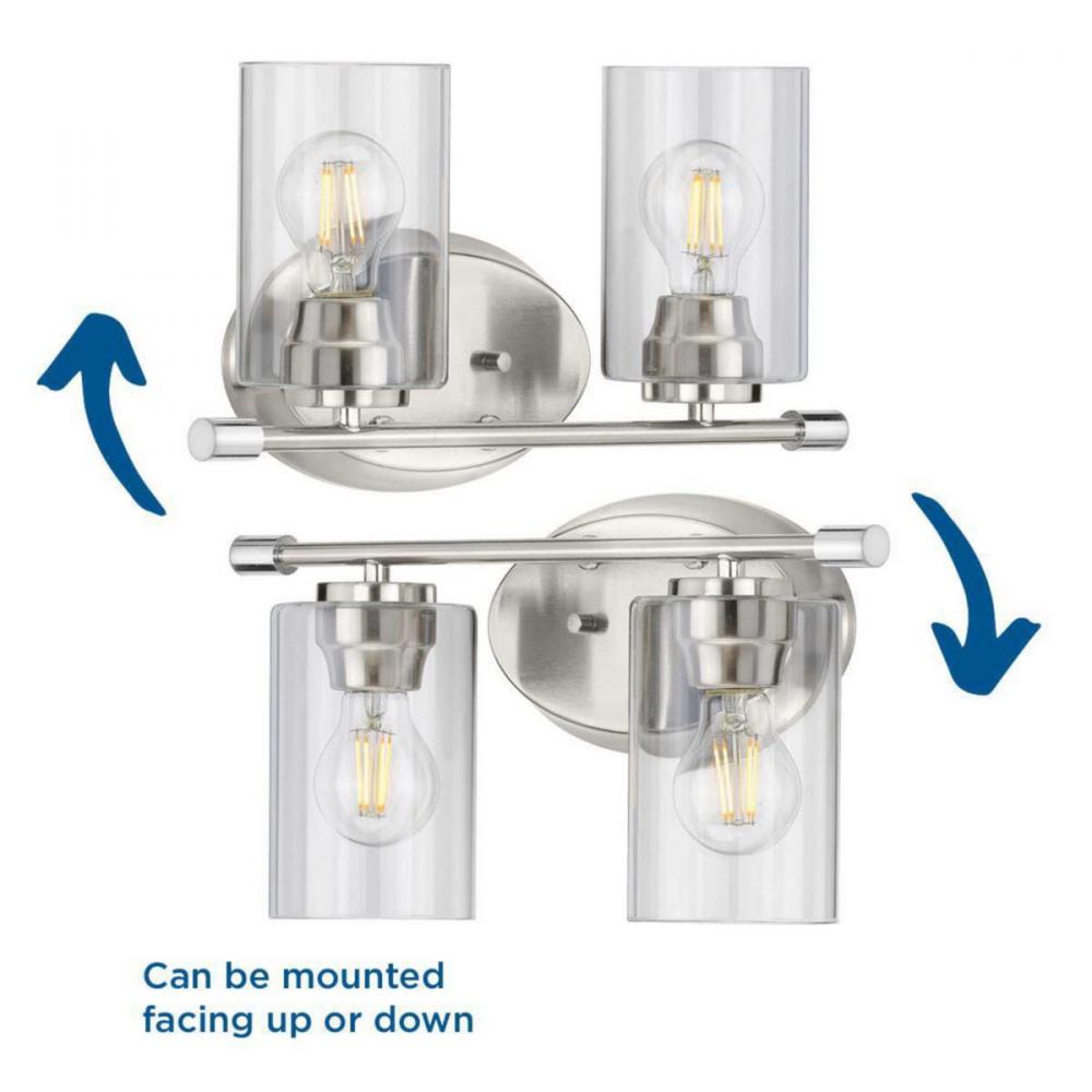 Ideal for a bathroom and powder room.;Perfect for modern, new traditional, traditional, and transitional style settings;Beautiful brushed nickel finish;Crisp clear glass shades;Mount the light fixture facing up or down;Use 2 medium base bulbs that are sold