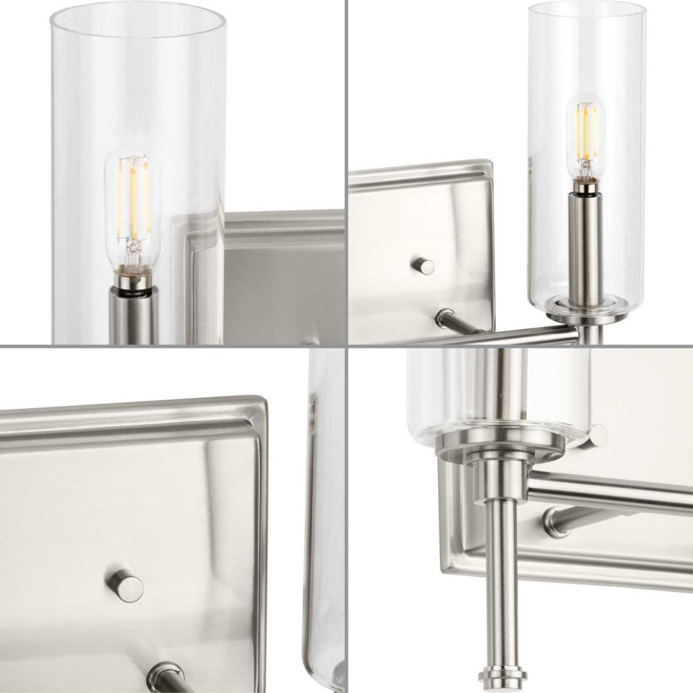 Elara features a slender, chic form with stylized finials that make it an elegant yet unobtrusive light for bathrooms;Its classically modern style is perfect for new traditional and transitional interiors;A beautiful brushed nickel finish enhances Elara