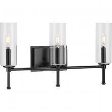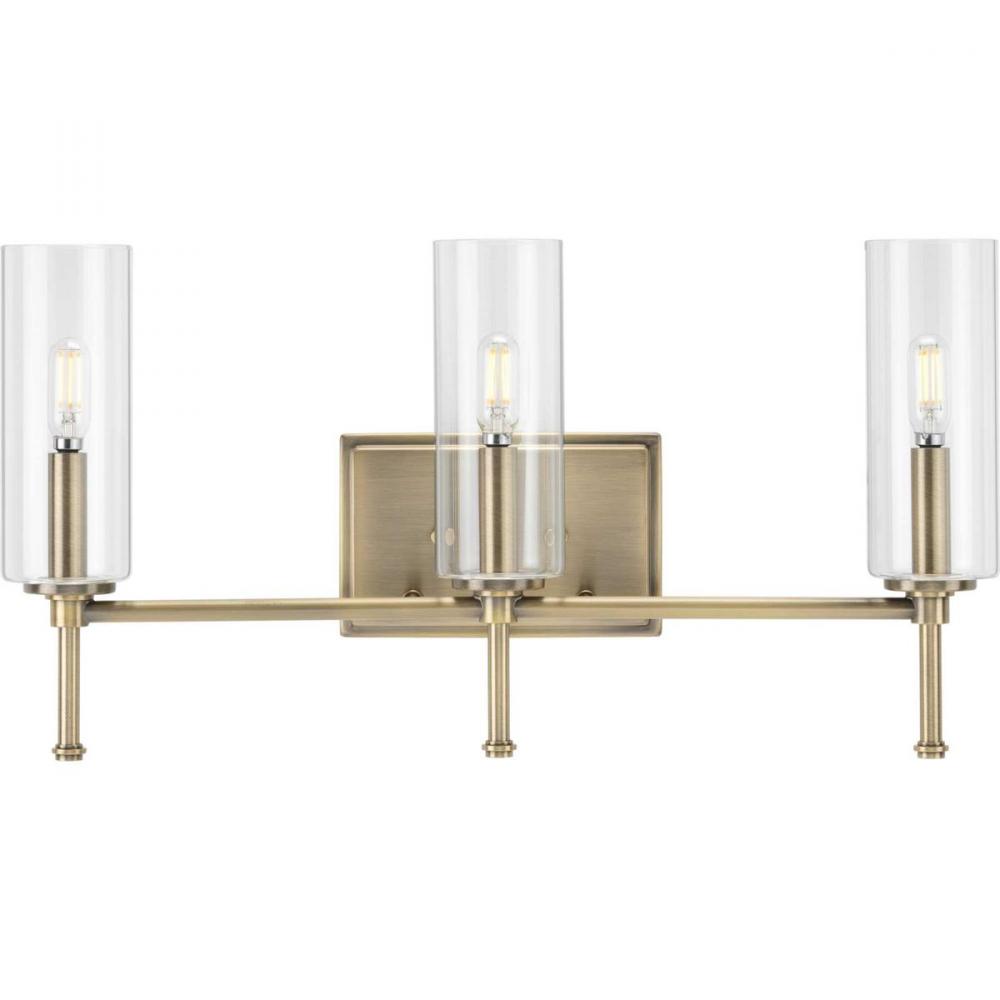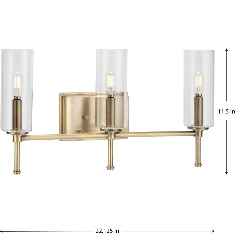 Ideal for a bathroom;Perfect for new traditional style settings;Golden vintage brass finish;Crisp clear cylindrical glass shades;Use 3 candelabra base bulbs that are sold separately (60w max - LED/CFL/incandescent), compatible with dimmable bulbs;Measures