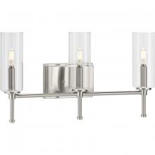 Feature a chic form with a bath vanity light from the Elara Collection. The slender frame with stylized finials inspired by chess pawns are coated in a golden vintage brass finish. Crisp clear cylindrical glass shades complete the classically modern design. Compatible with dimmable bulbs.