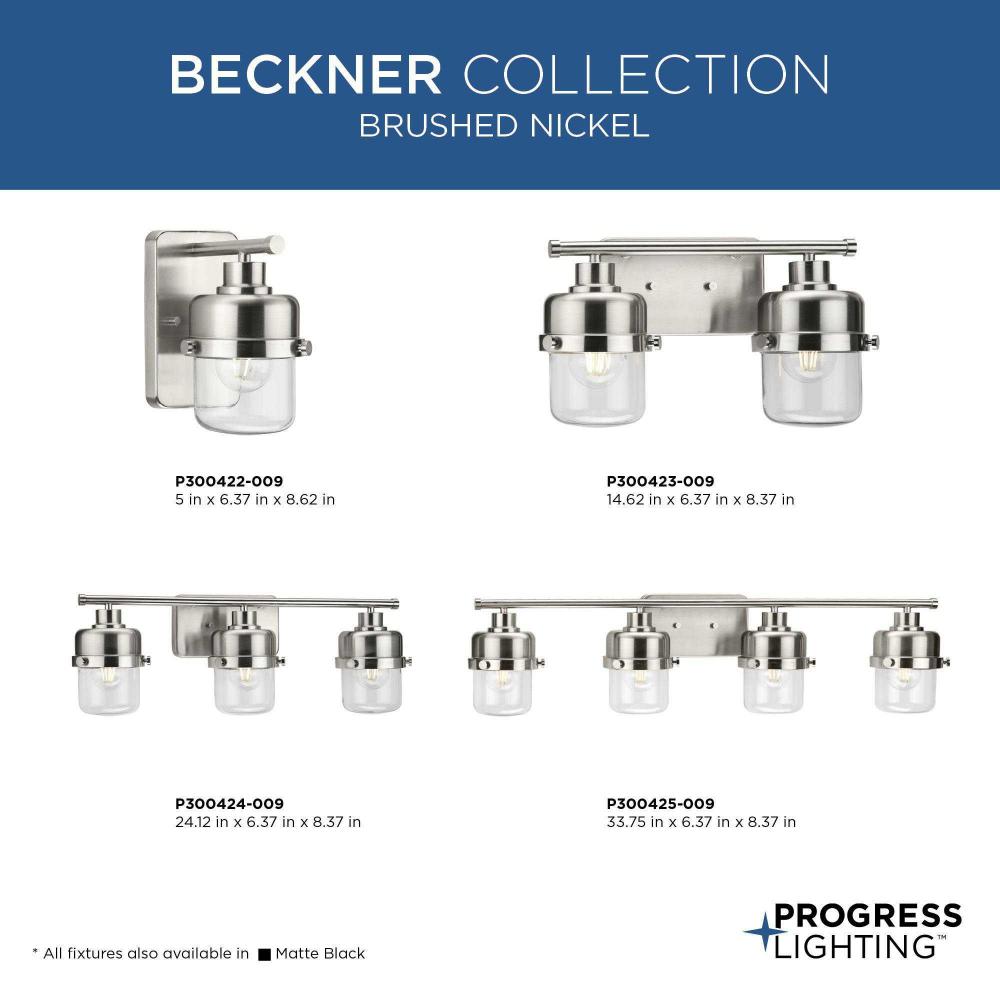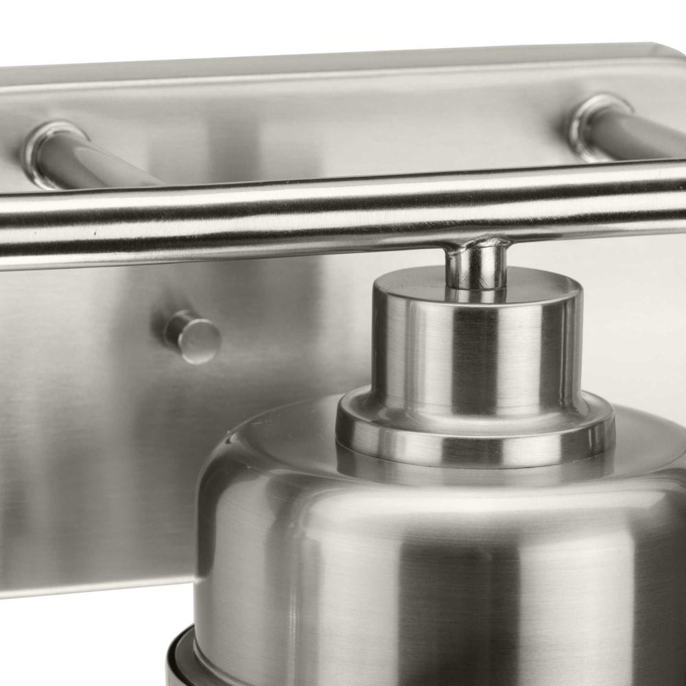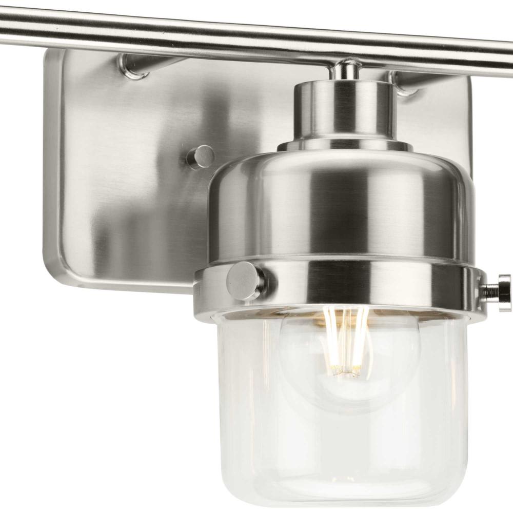 The Beckner Collection reflects mid-century and industrial design, with mechanical knobs and hooded lights finished in subtle brushed nickel. Beckner’s tactile appeal welcomes curiosity and adds depth to bathrooms and powder rooms in mid-century modern, transitional and urban industrial settings. An oblong backplate holds a rod which suspends its vintage-style shades complemented by clear glass, delivering bright illumination while adding a modern touch. This versatile fixture can be mounted up or down, increasing its design flexibility. cULus damp location listed, with a one-year warranty to guarantee your complete satisfaction. Progress Lighting products are designed for exceptional quality, reliability, and functionality.