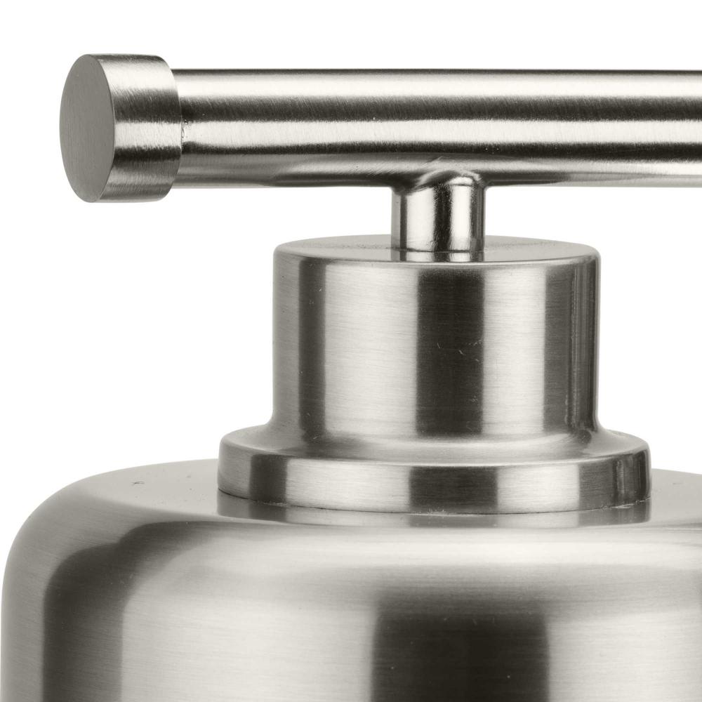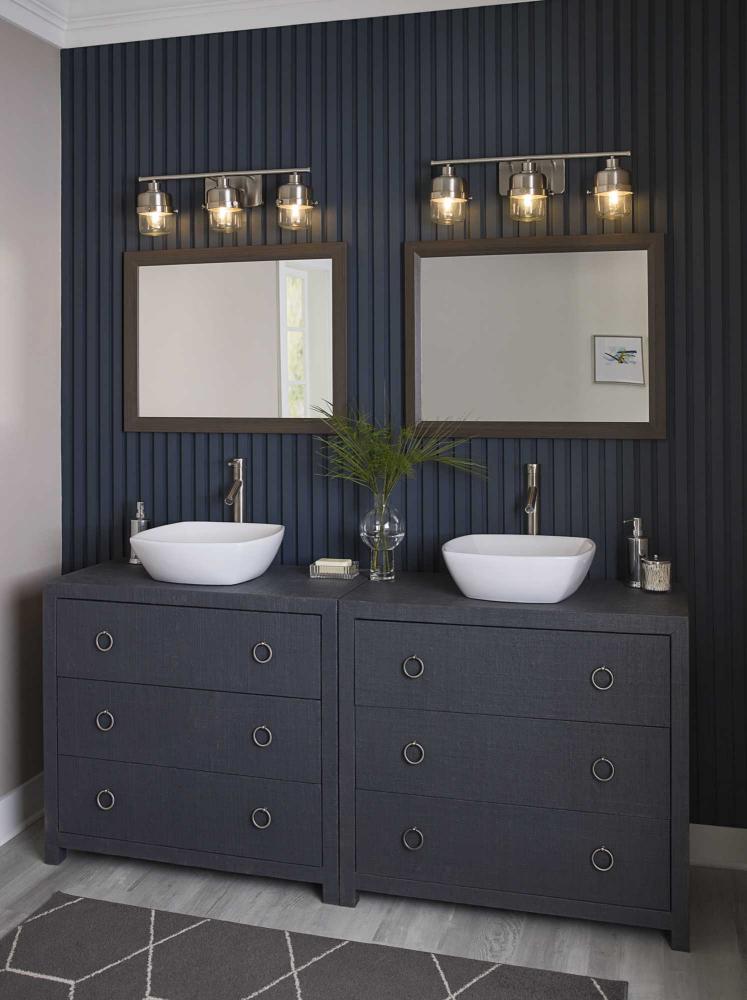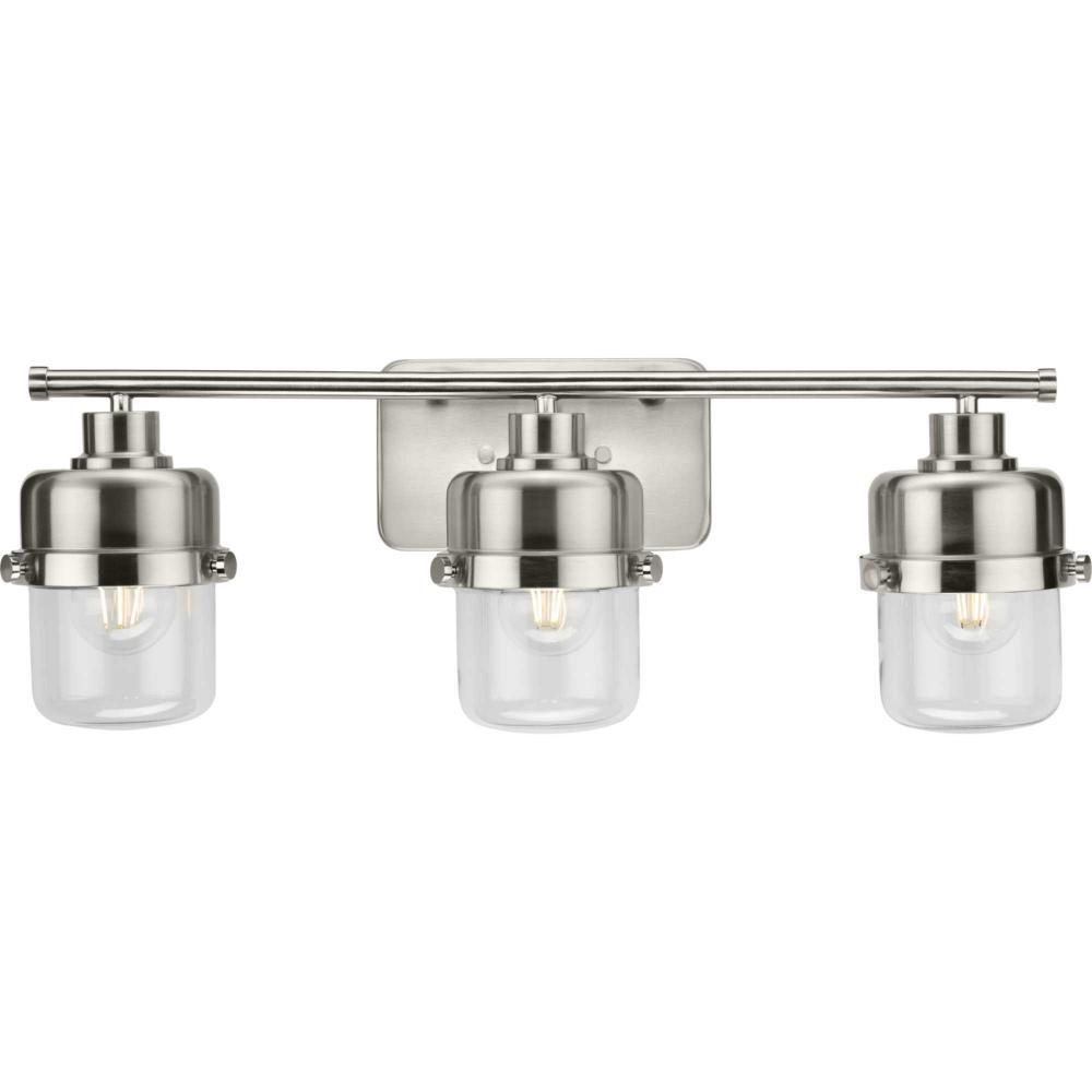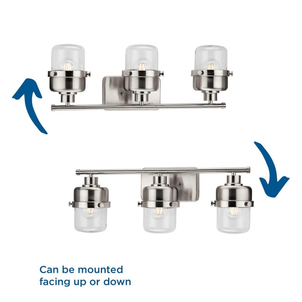 The Beckner Collection reflects mid-century and industrial design, with mechanical knobs and hooded lights finished in subtle brushed nickel. Beckner’s tactile appeal welcomes curiosity and adds depth to bathrooms and powder rooms in mid-century modern, transitional and urban industrial settings. An oblong backplate holds a rod which suspends its vintage-style shades complemented by clear glass, delivering bright illumination while adding a modern touch. This versatile fixture can be mounted up or down, increasing its design flexibility. cULus damp location listed, with a one-year warranty to guarantee your complete satisfaction. Progress Lighting products are designed for exceptional quality, reliability, and functionality.