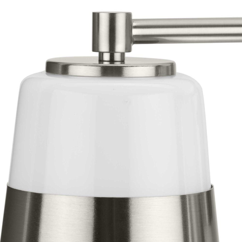 The Haven Collection is practical and stylish with a modern color blocking silhouette that fits perfectly in luxe industrial and contemporary rooms. The metal frame is finished in subtle brushed nickel and features shades suspended from an oblong backplate. Etched opal glass casts a pleasing, softened glow in bathrooms and powder rooms. This versatile fixture can be mounted up or down, increasing its design flexibility. It is cULus damp location listed, with a one-year warranty to guarantee your complete satisfaction. Progress Lighting products offer exceptional quality, reliability, and functionality.