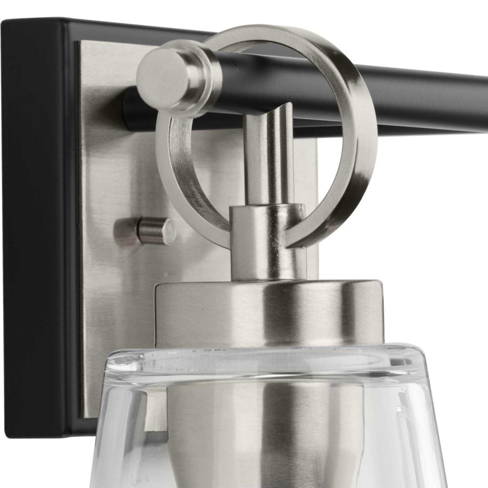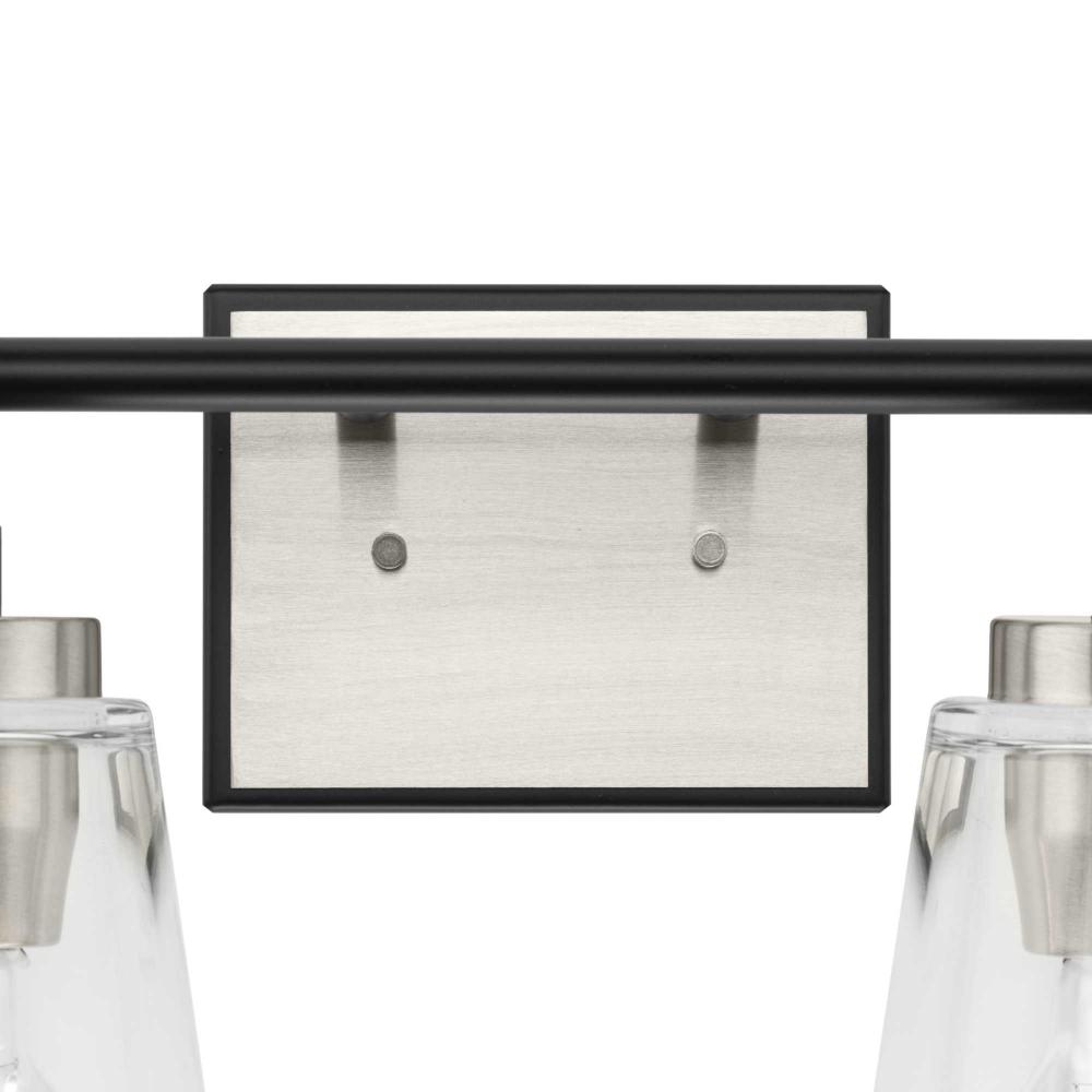 The Cassell Two-Light Vanity Fixture brings an enduring style to the bath. The light boasts a dual-tone finish of Brushed Nickel and Matte Black that accentuates its distinguished and handsome design. Tailored details smoothly blend linear precision with elegant circular rings and clear glass shades.