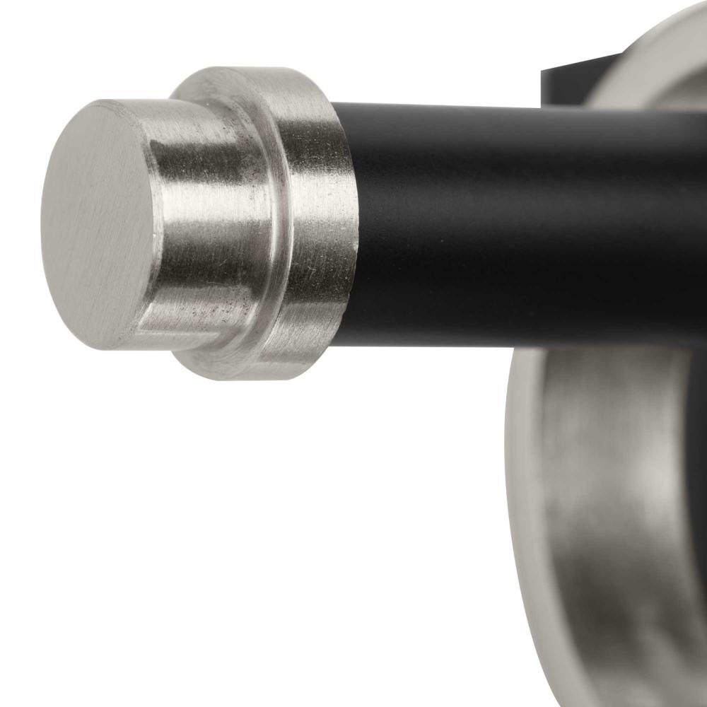 The fixture's brushed nickel and matte black accents provide an elegant, detailed look in luxe industrial and contemporary interiors