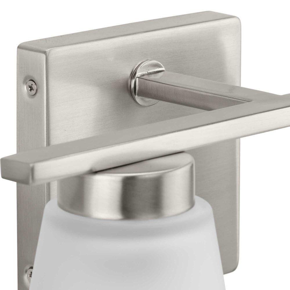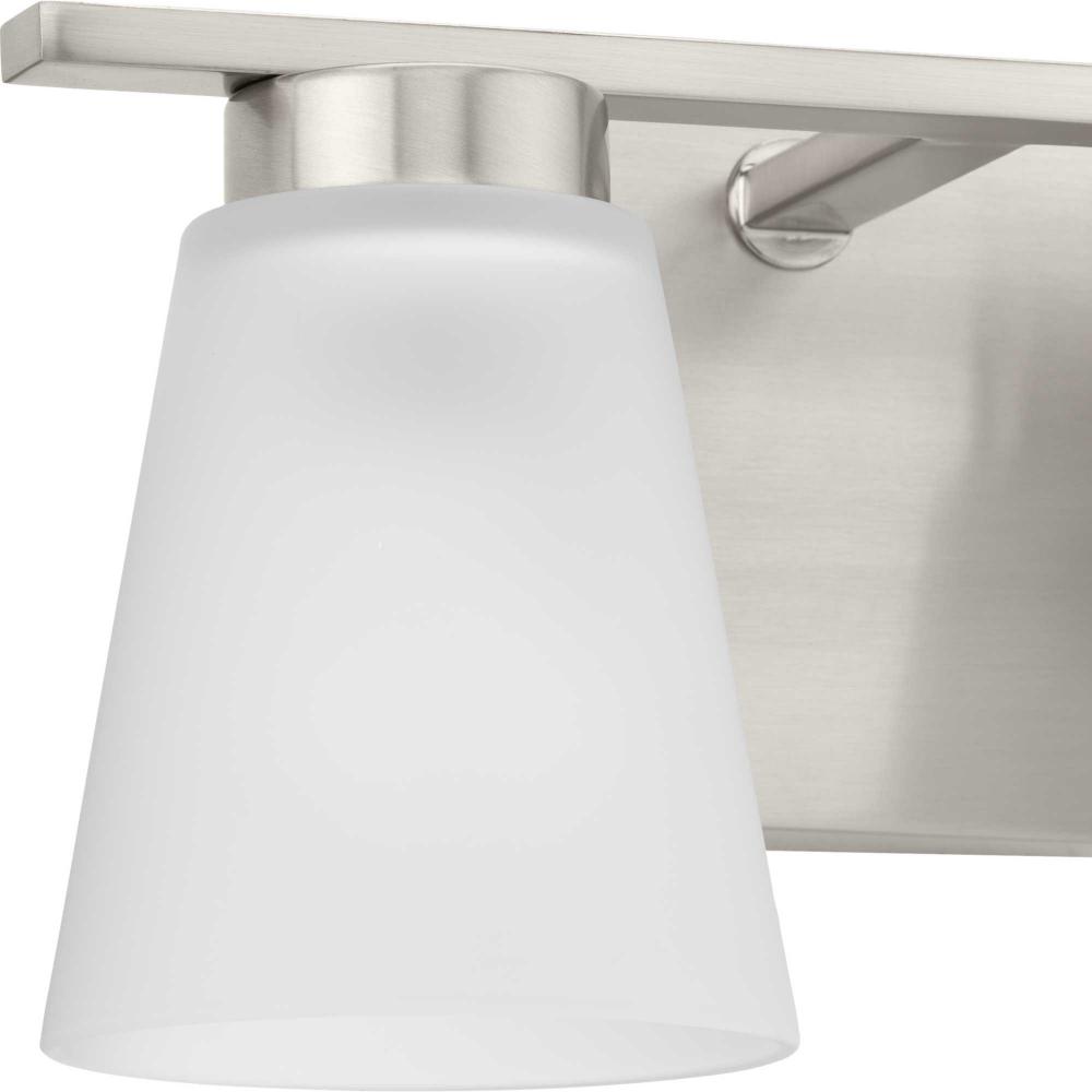 Fill your house with the lively Tanner family of fixtures. Strong lines accent the Brushed Nickel frame in a simple balance of form and function, while soft etched glass shades complement the design. The versatile fixture can be mounted with the shades facing up or down to suit your preference.