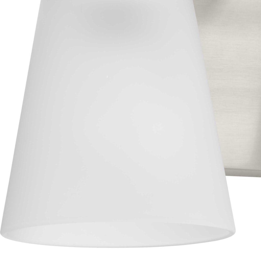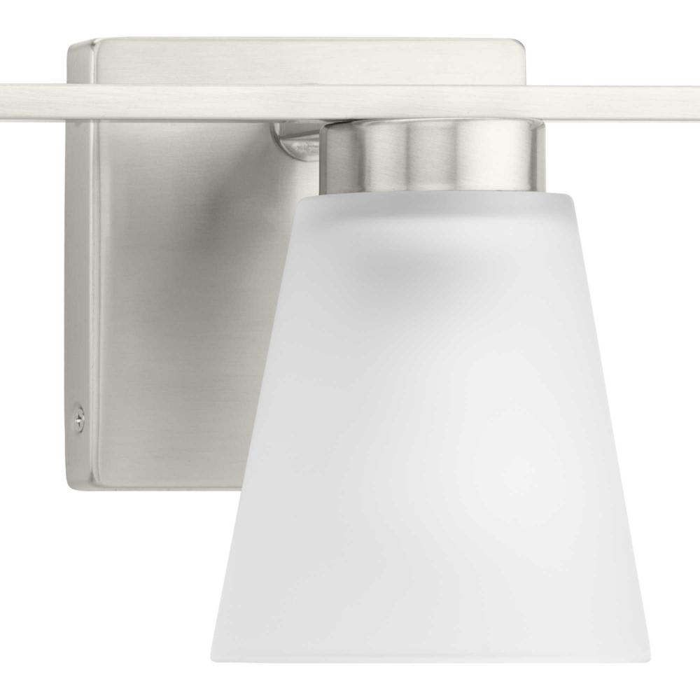 Fill your house with the lively Tanner family of fixtures. Strong lines accent the Brushed Nickel frame in a simple balance of form and function, while soft etched glass shades complement the design. The versatile fixture can be mounted with the shades facing up or down to suit your preference.