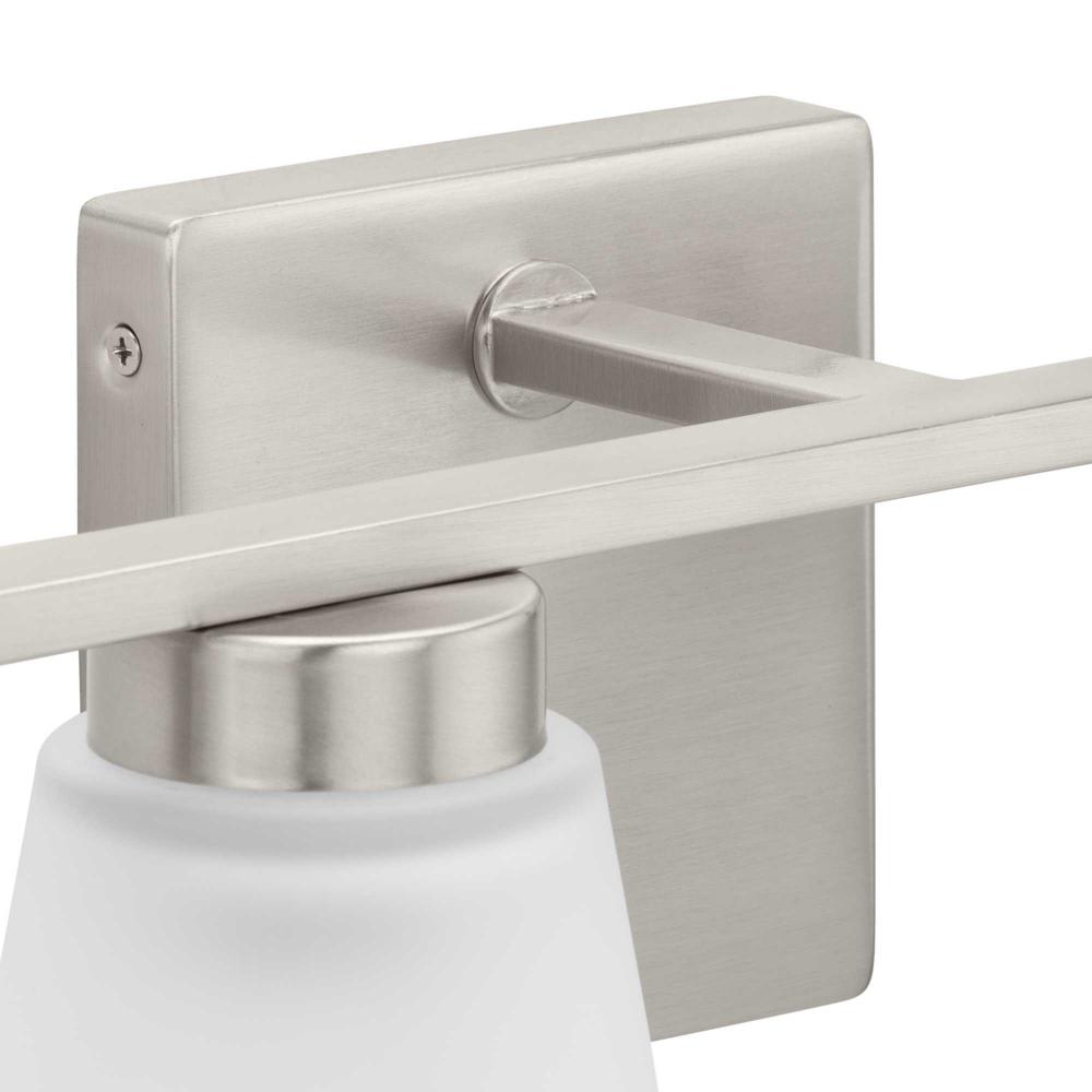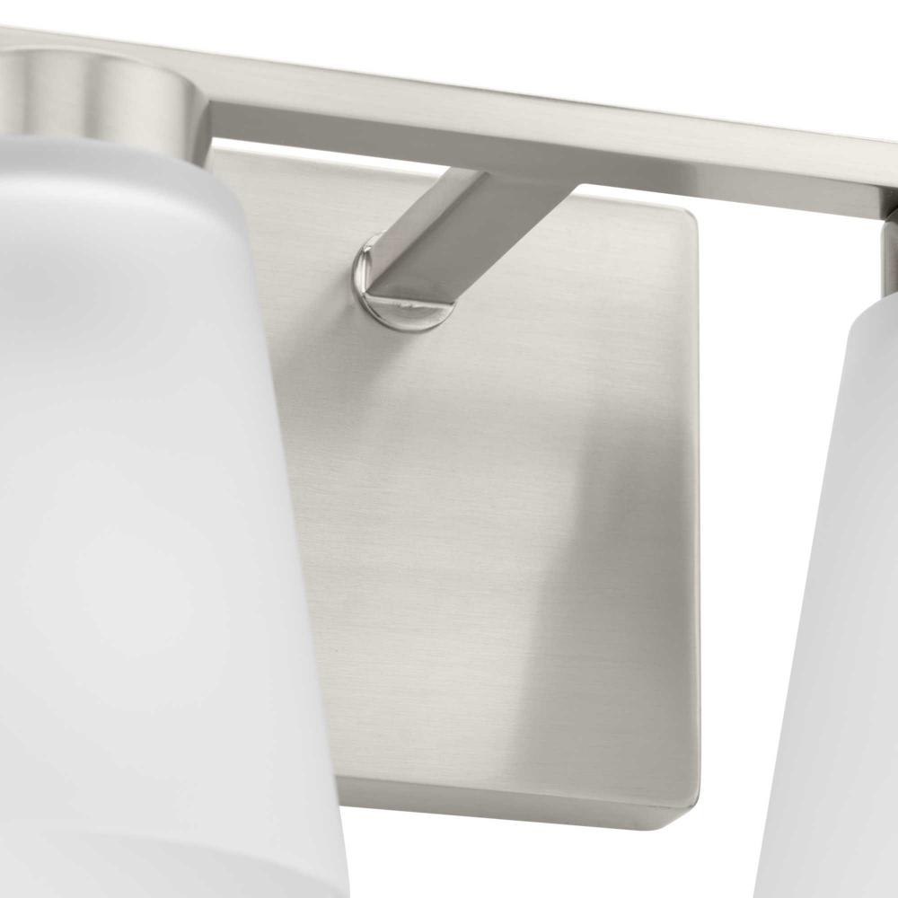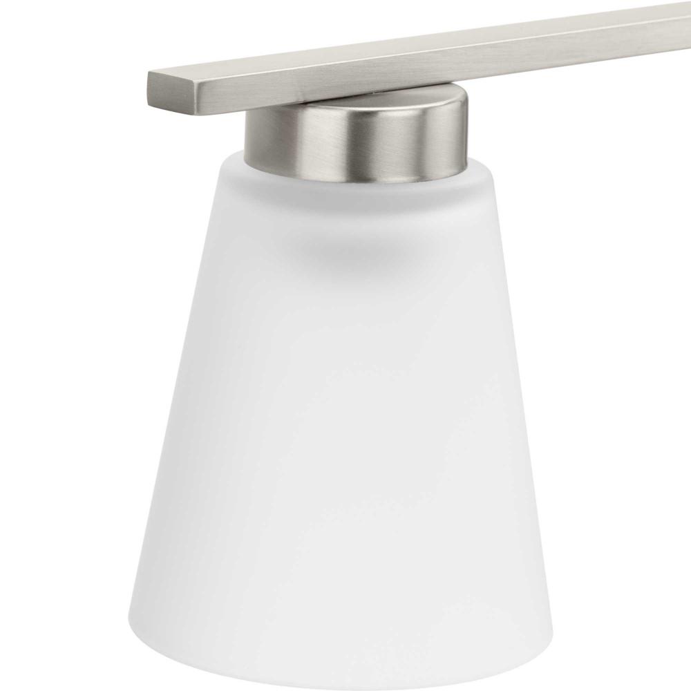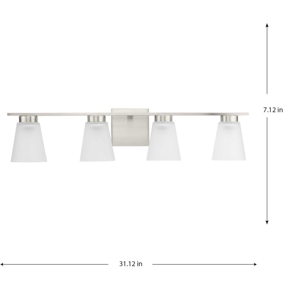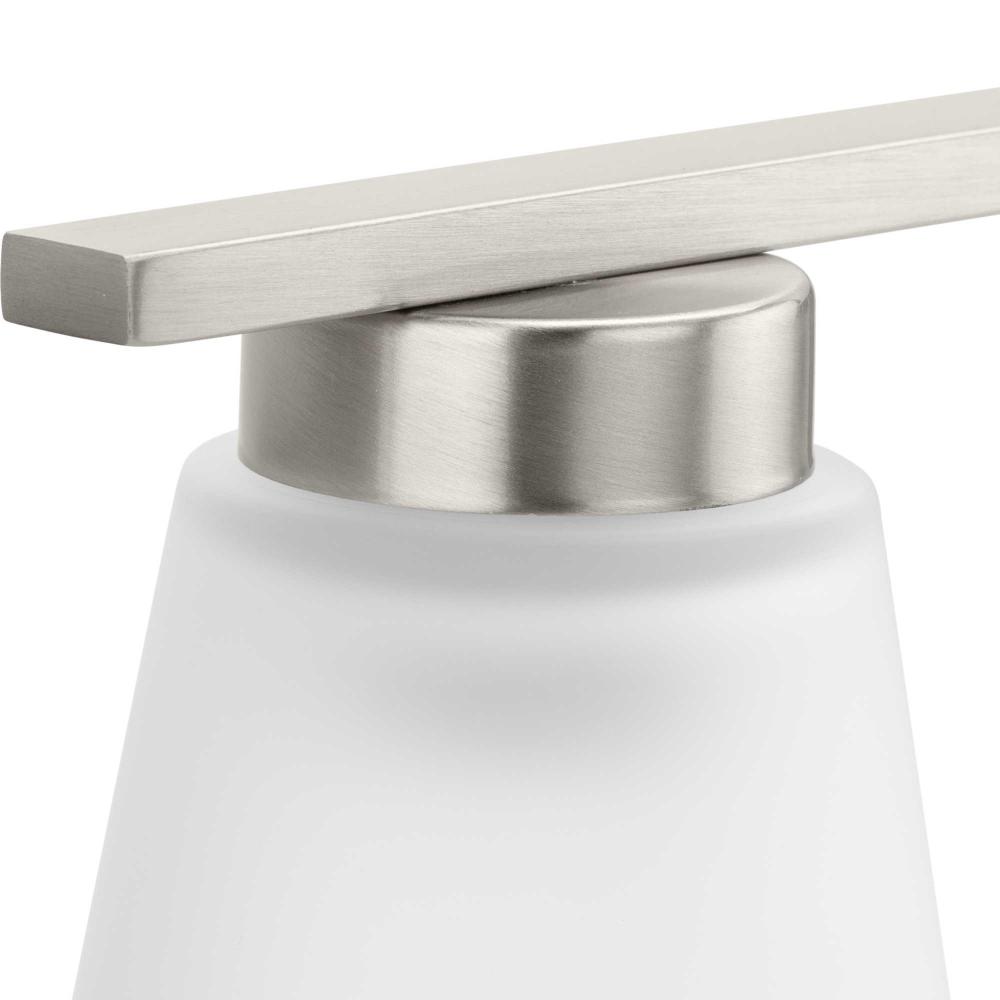 Fill your house with the lively Tanner family of fixtures. Strong lines accent the Brushed Nickel frame in a simple balance of form and function, while soft etched glass shades complement the design. The versatile fixture can be mounted with the shades facing up or down to suit your preference.