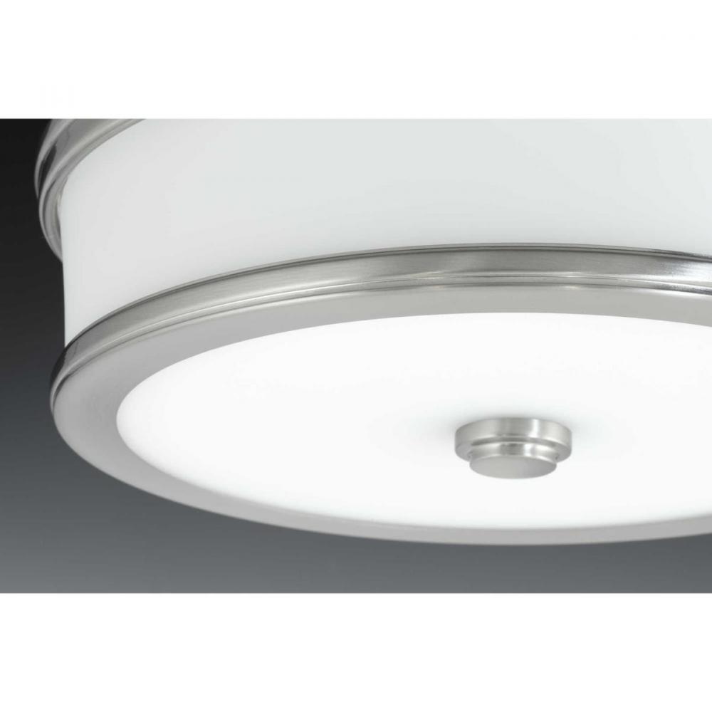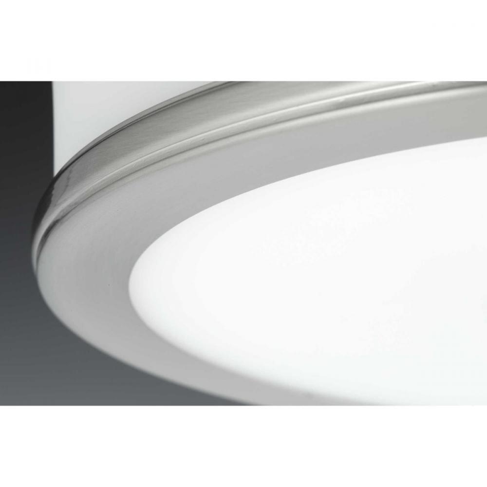 Features a sleek and slim appearance inspired by architectural design;One light LED flush mount;Popular Brushed Nickel finish;The glass shade is illuminated on both the bottom and sides to provide a pleasing lighted effect;Features 25-watt integrated LED t