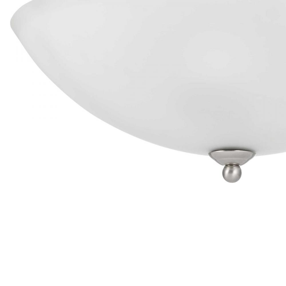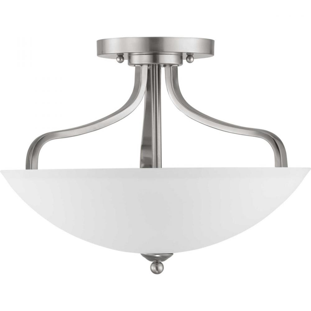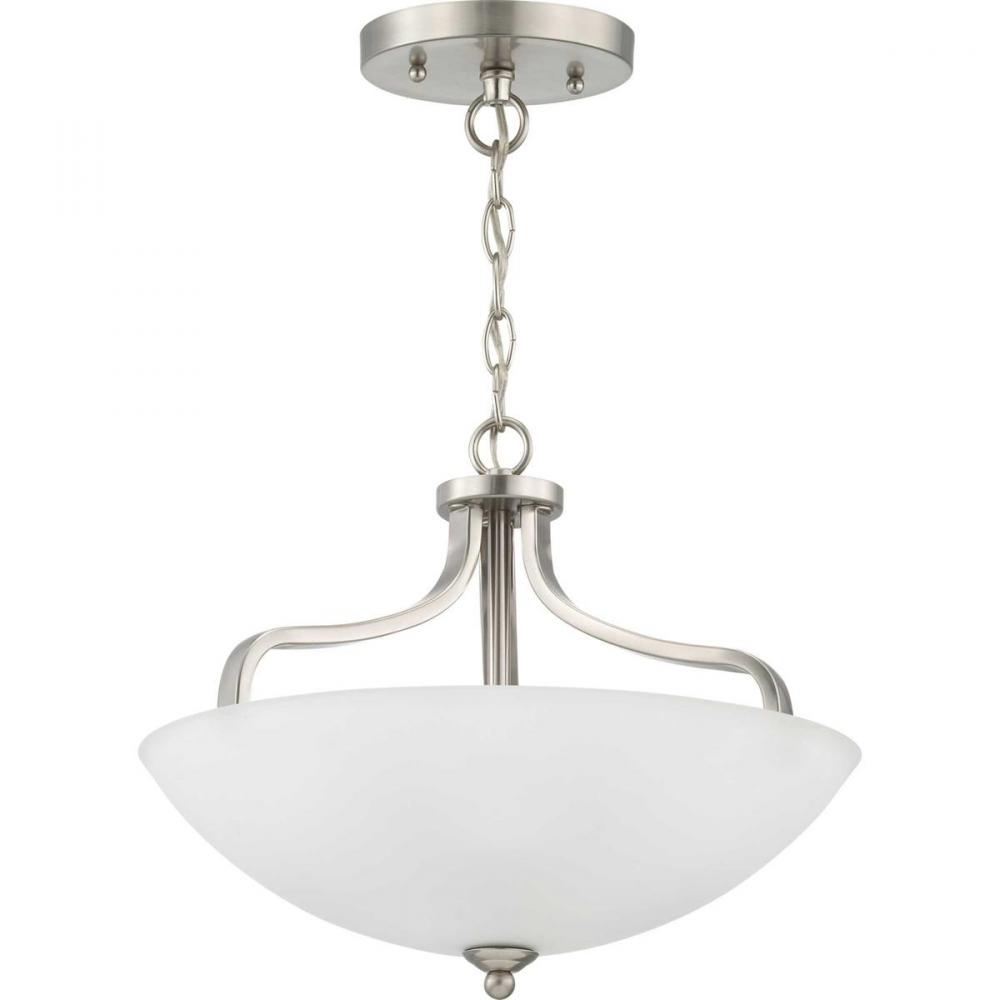 The three-light semi-flush fixture that also can convert to a hanging fixture from the Laird collection provides a contemporary complement to casual interiors popular in today's homes. Glass shade with scrolling arms add distinction and provide pleasing illumination to any room, creating an airy effect. Brushed Nickel finish.