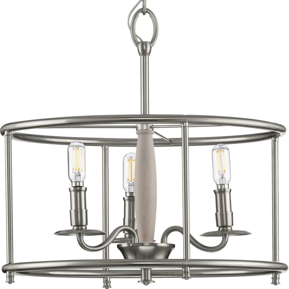 A round, open-cage frame coated in a farmhouse-style brushed nickel highlights the light fixture’s rustic demeanor.;Inside the frame nestle light bases reminiscent of vintage candlesticks on gently curving metal arms.;A wooden column at the ceiling light