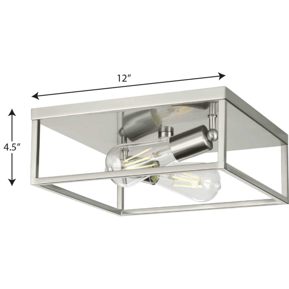 Inspired by a geometric simplicity, the Perimeter Collection 2-Light Brushed Nickel Modern Flush Mount Ceiling Light. The square frame composed of clean, straight lines is coated in a silver brushed nickel finish. Light sources peek from inside the crisp open-frame design that accentuates the light fixture's modern aesthetic.