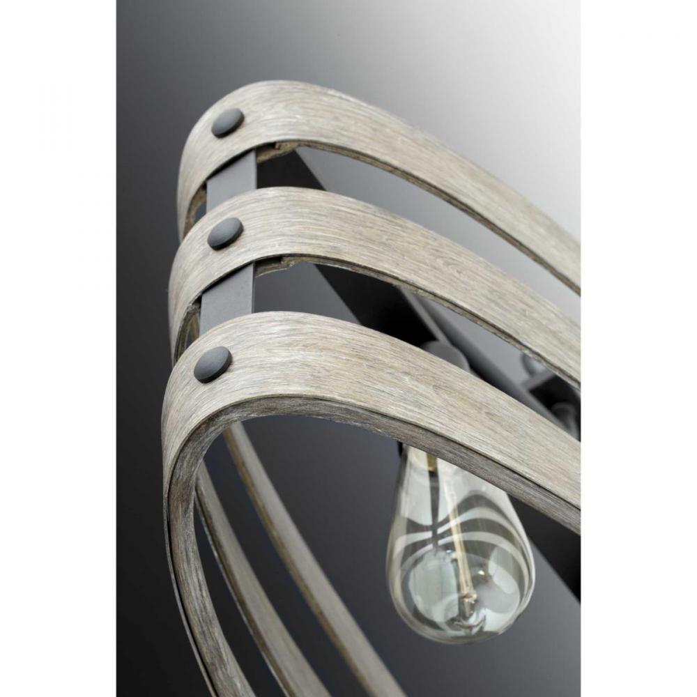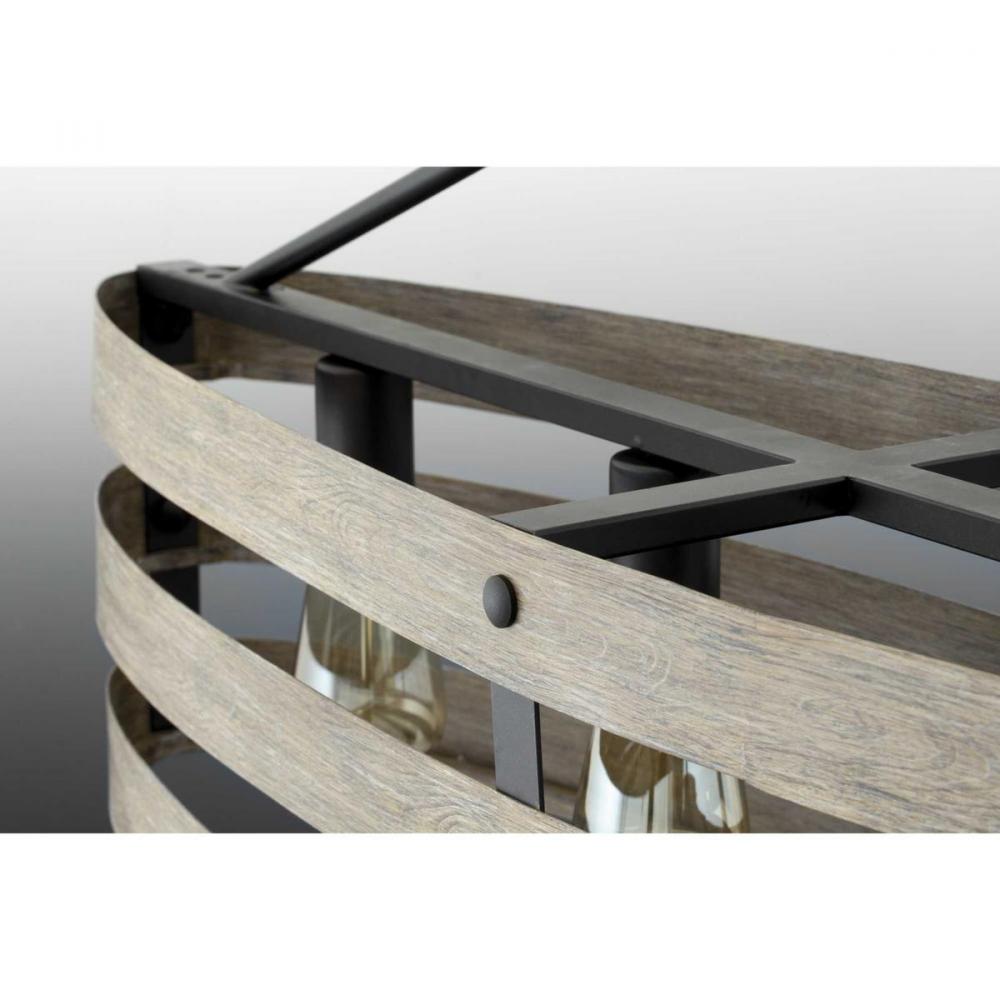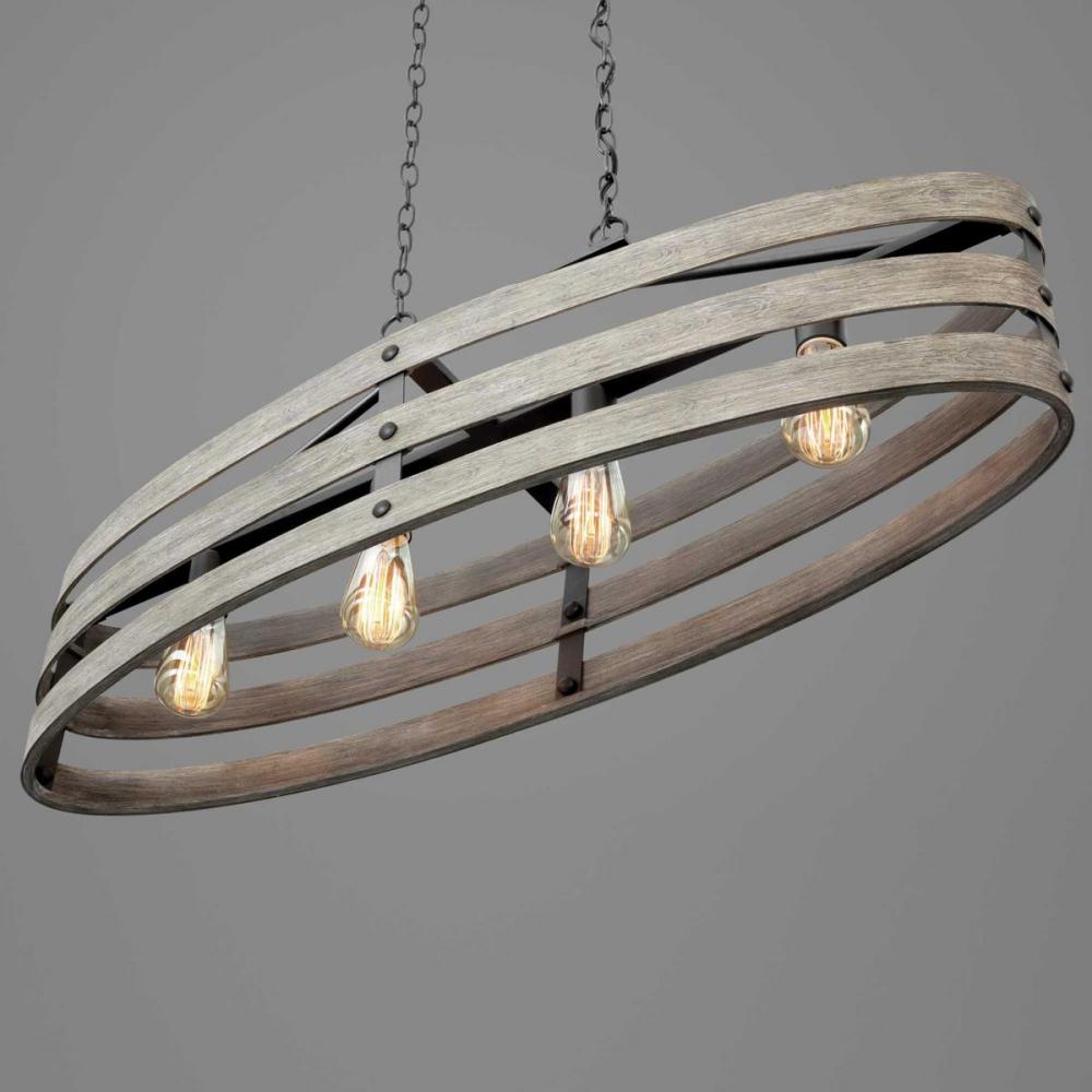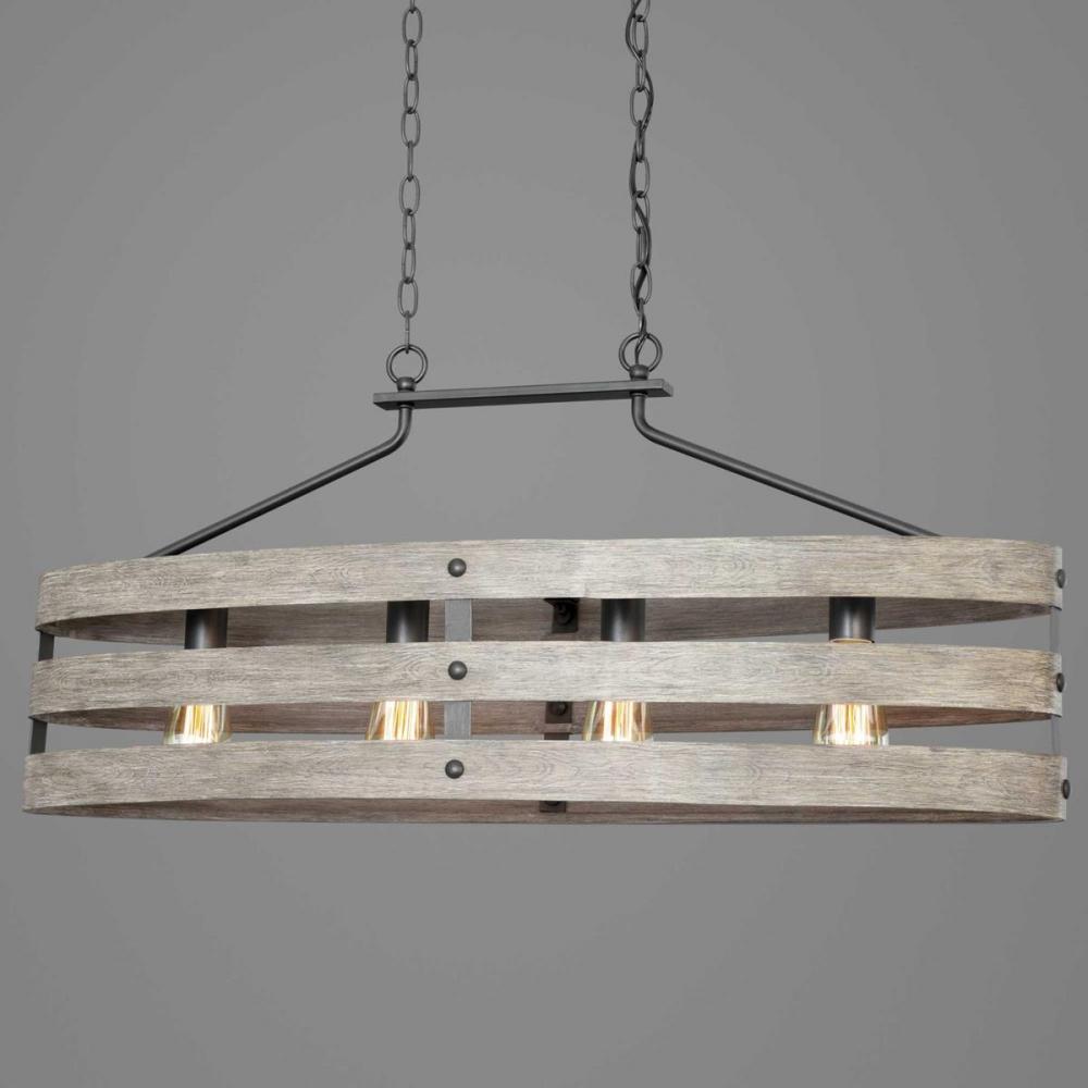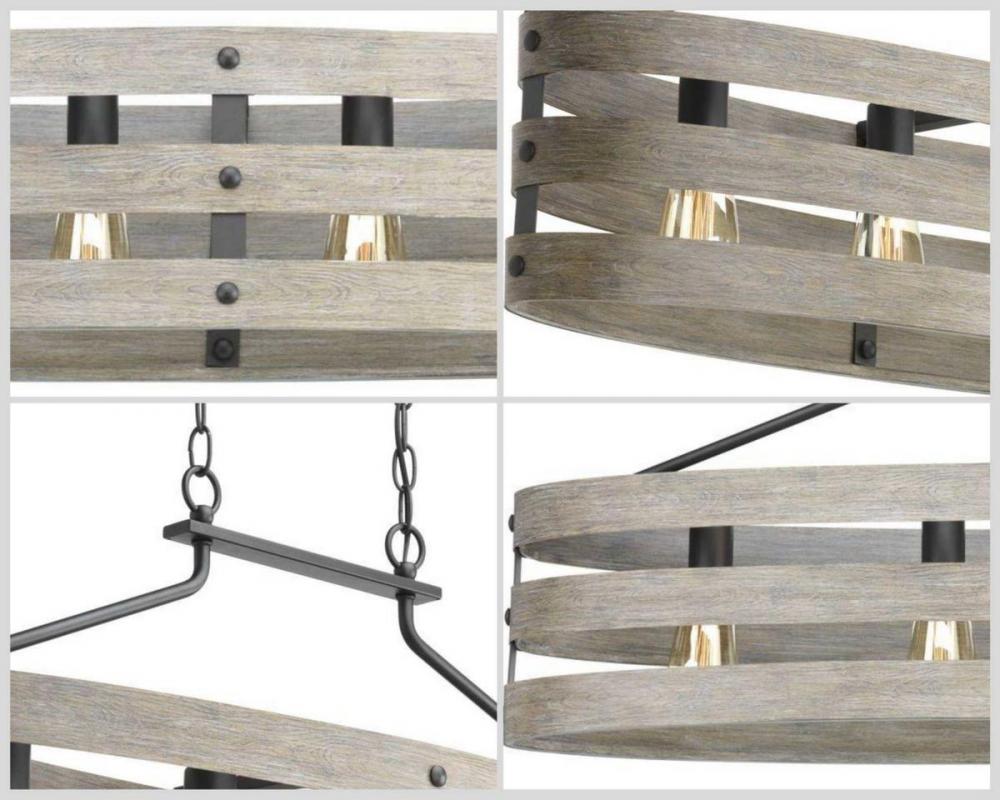 Three circular bands wrap together to create an open design for Gulliver four-light linear chandelier. Dual toned frame color combinations of Graphite with weathered gray accents. A hand painted wood grained texture complements Rustic and Modern Farmhouse home decor, as well as Urban Industrial and Coastal interior settings.
