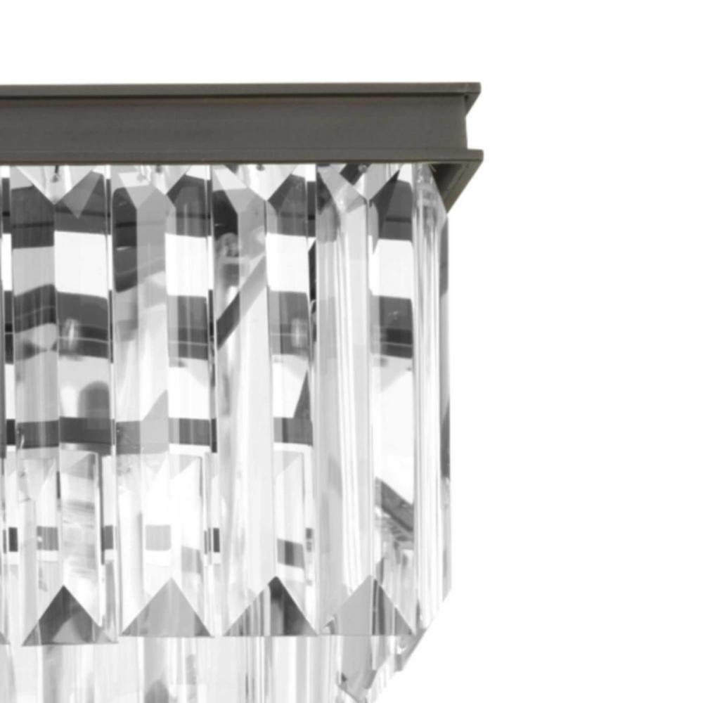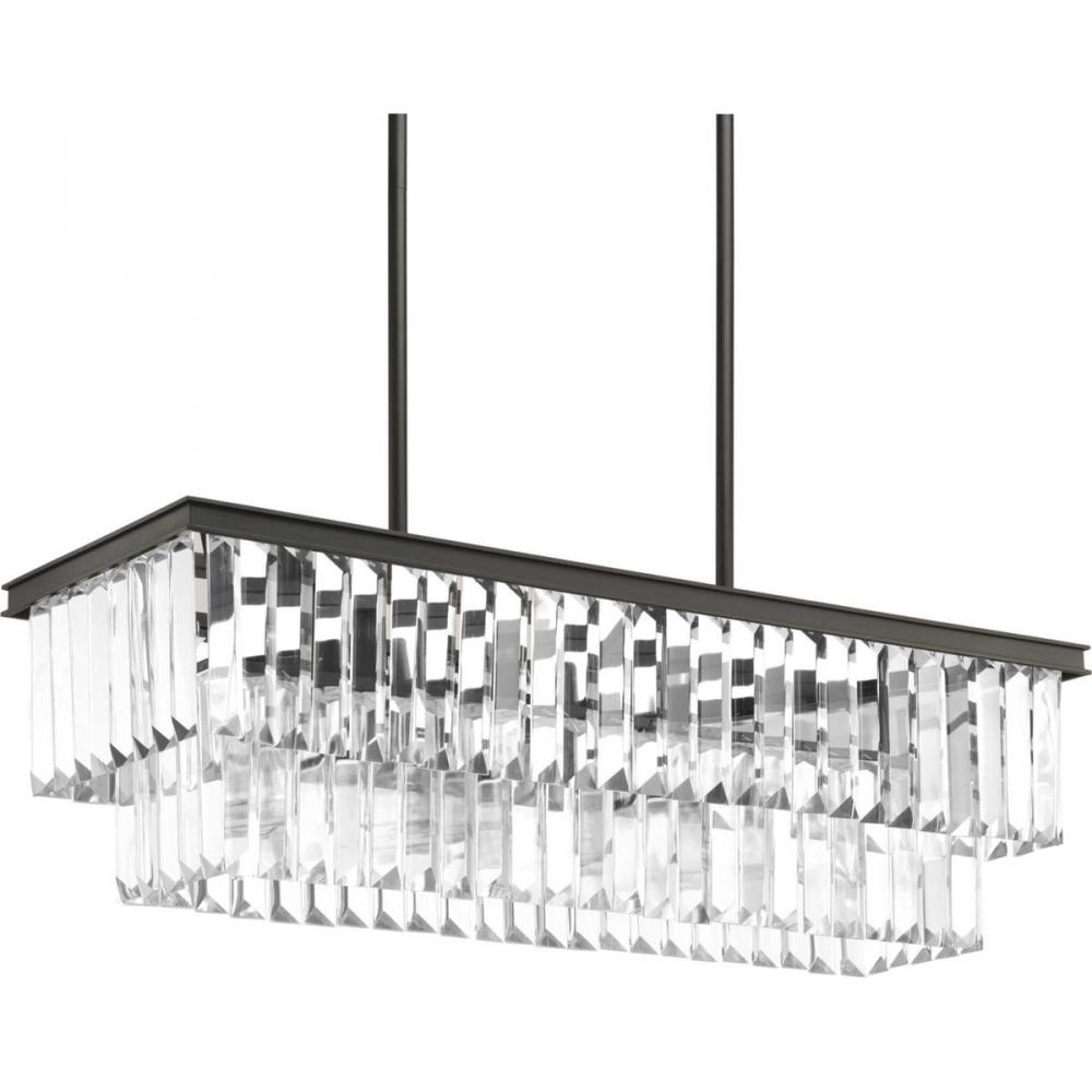 Glimmer fits the definition of livable luxury with elements that sparkle to create an instant statement within the home. Prismatic glass Prismatic glass four-light square linear chandelier is supported by an architecturally- styled frame in Antique Bronze finish. The cascade of faceted linear glass deliver a sleek silhouette to any room.