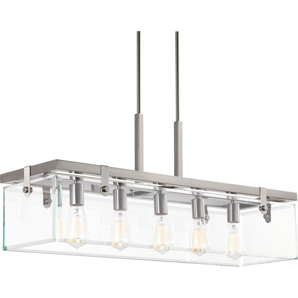 Inspired by modern architecture. Glayse features handsome details for variety of interior design styles. The frameless unbounded beveled glass creates beautiful light and reflection. The structure of Glayse is the focal point of the design, where form follows function. The five-light linear chandelier is complimented by a Brushed Nickel finish.