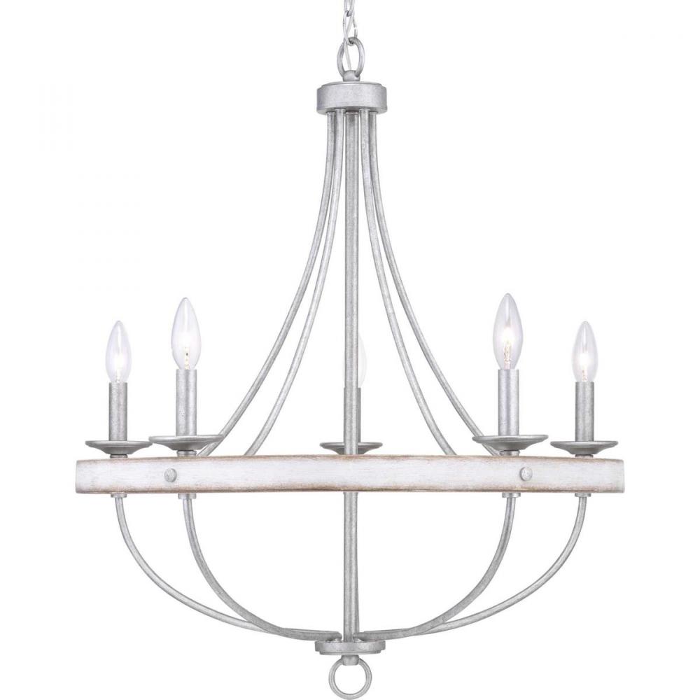The five-light chandelier in the Gulliver Collection features arching and delicate details that curve to create an airy design. Dual toned frame color combinations in a Galvanized finish with antique white accents The hand painted wood grained texture finished to emulate weathered driftwood complements Rustic and Modern Farmhouse home decor, as well as Urban Industrial and Coastal interior settings.
