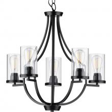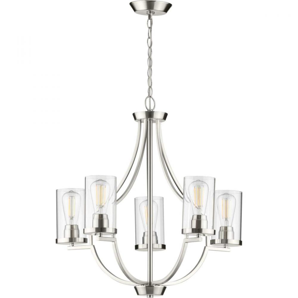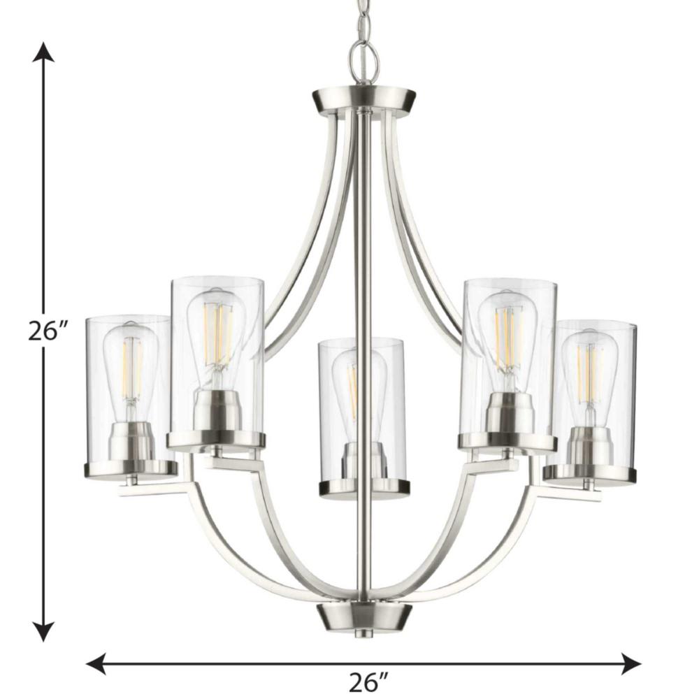 Manifest a swoon-worthy lighting experience with the stunning blend of the modern and traditional styles in this one-of-a-kind chandelier. Square tubing with clean, sharp angles is coated in a beautiful brushed nickel finish that demands your attention. Striking vintage light sockets boast their bold yet simple demeanor as they hold clear glass shades to complete this statement-making light fixture.