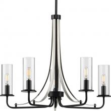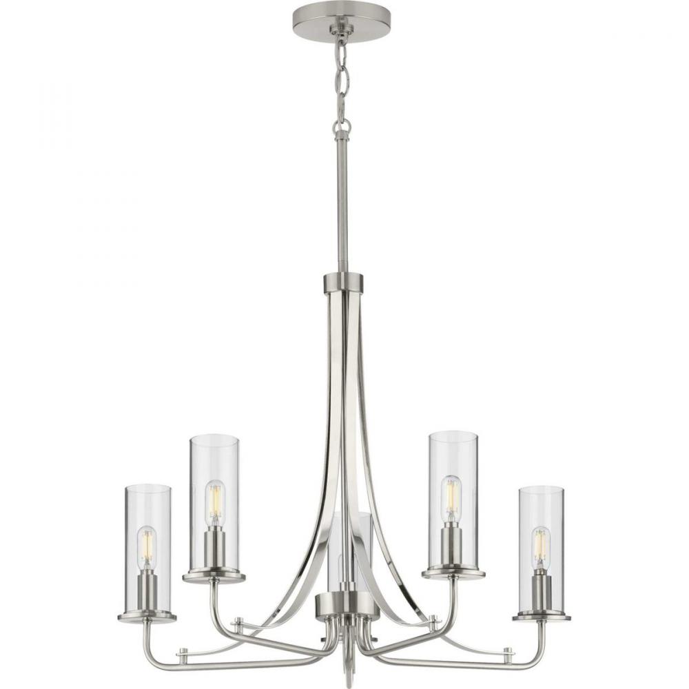 Incorporate a sleek simplicity and natural beauty with the Riley Collection's Five-Light Brushed Nickel Chandelier. Clear glass shades are ready to offer stunning, rejuvenating illumination. The shades rest on a gorgeous brushed nickel frame with polished chrome accents that manifests feelings of tranquility and serenity.