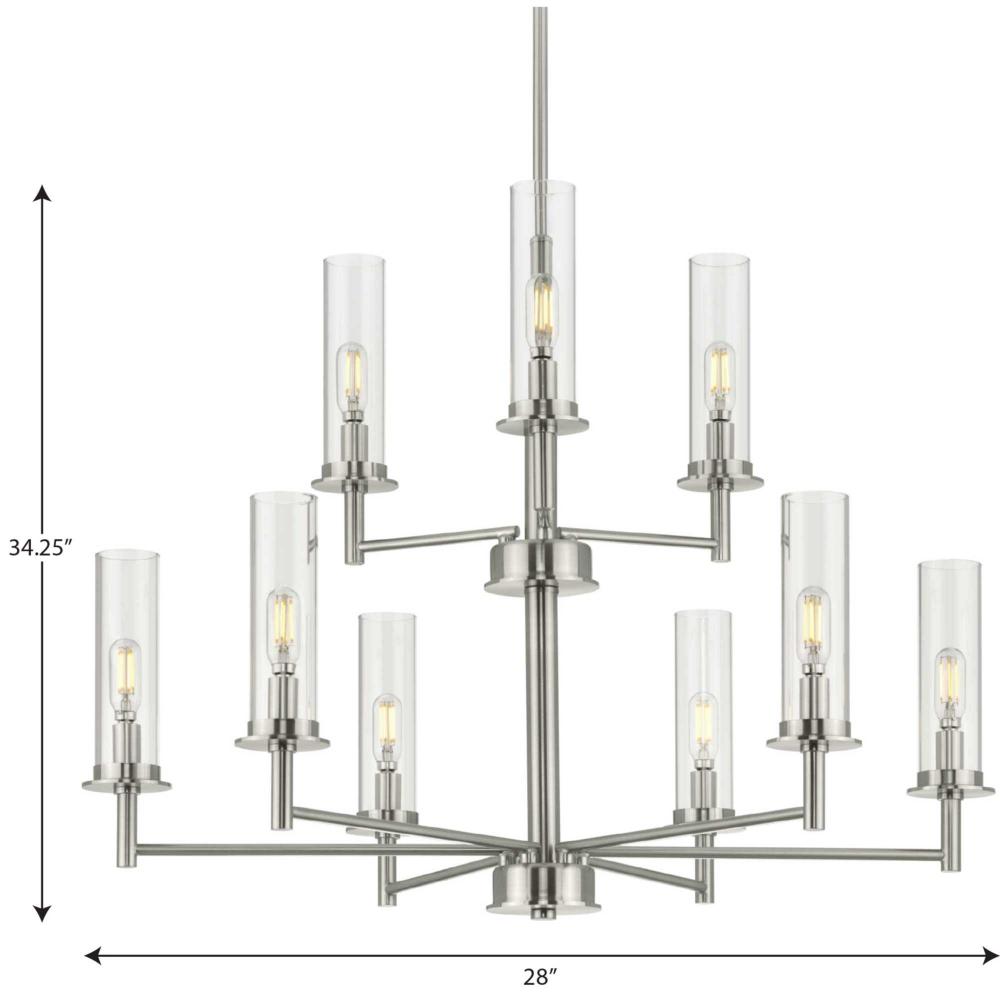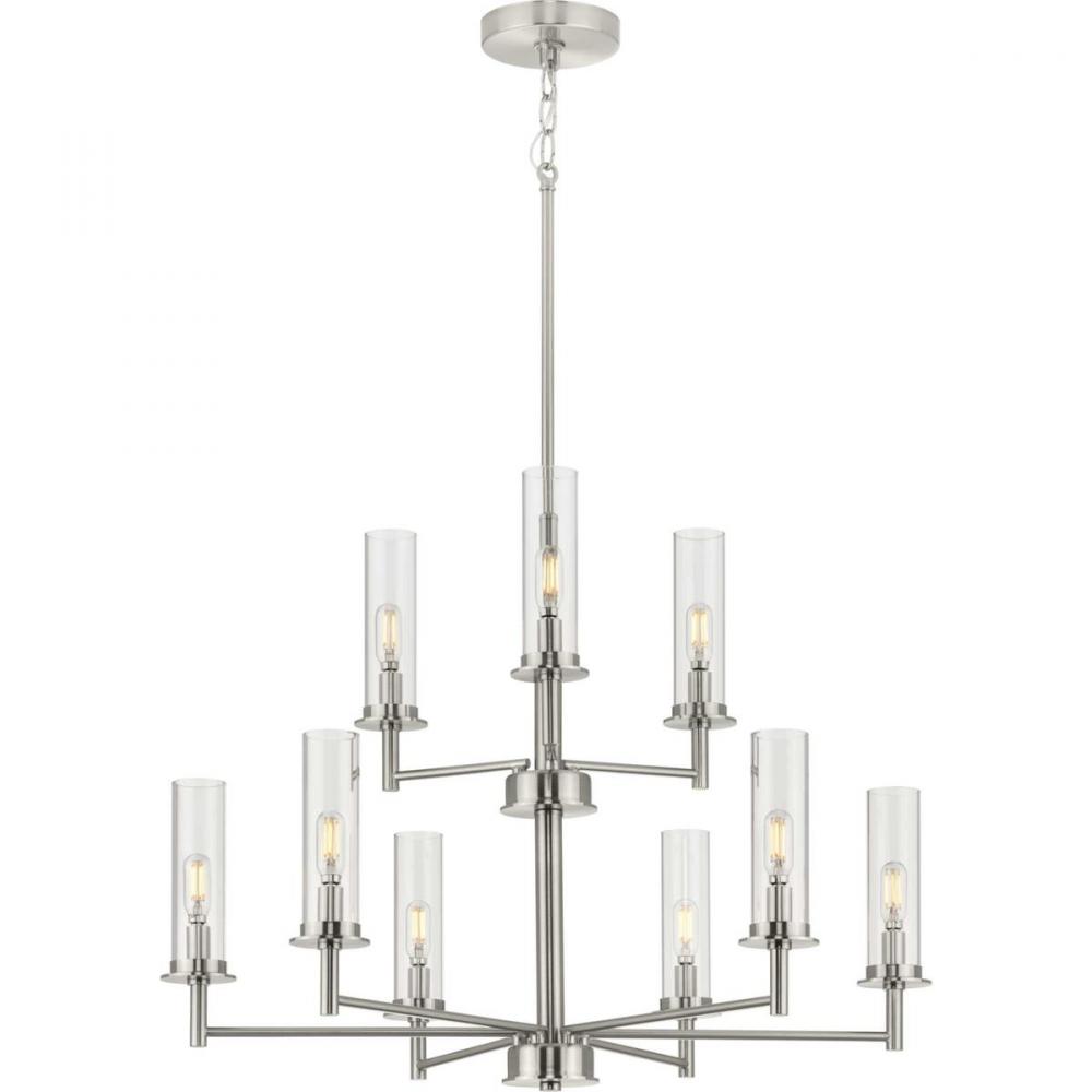 Balance the best of modern and traditional with the Kellwyn Collection 9-Light Brushed Nickel Clear Glass Transitional Chandelier Light. The classic frame with crisp, clean lines is coated in a beautiful brushed nickel finish. Light sources glow from inside cylindrical glass shades that add a touch of luxury to the design.