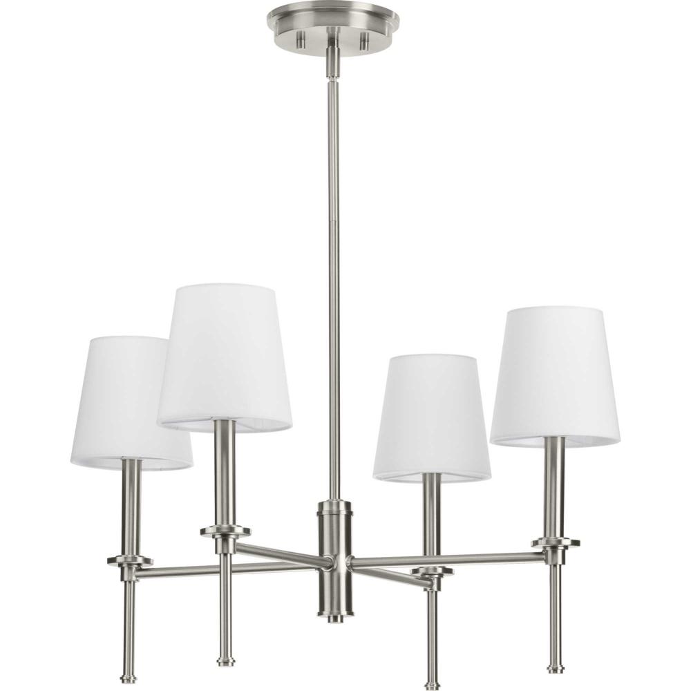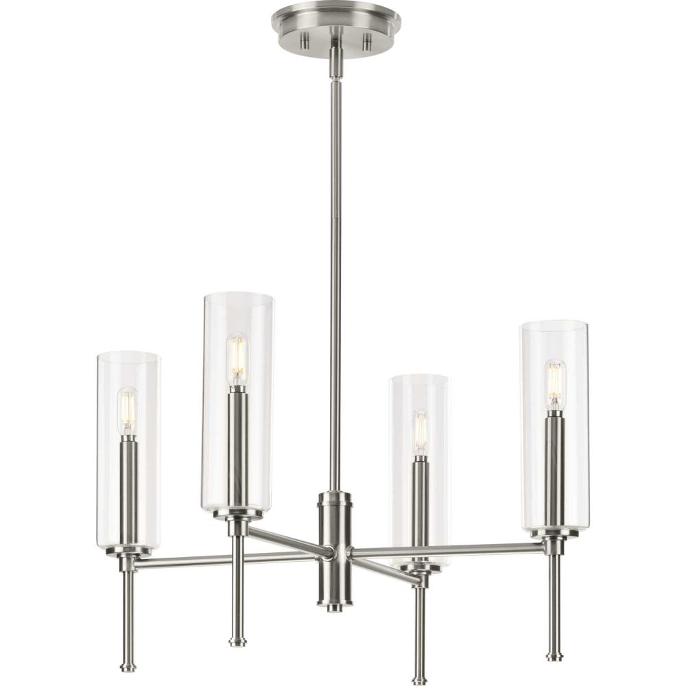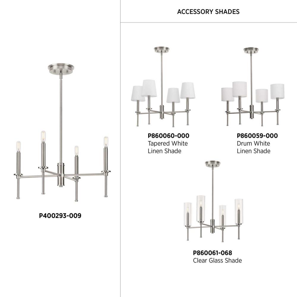 Elara has a clean contemporary design that works across many decor styles. The chandelier features a slender, chic form with stylized finials inspired by a chess pawn for a classically modern look. Select tapered or fabric drum shades, or clear cylindrical glass shades to customize the design and create the perfect amount of even illumination.