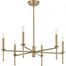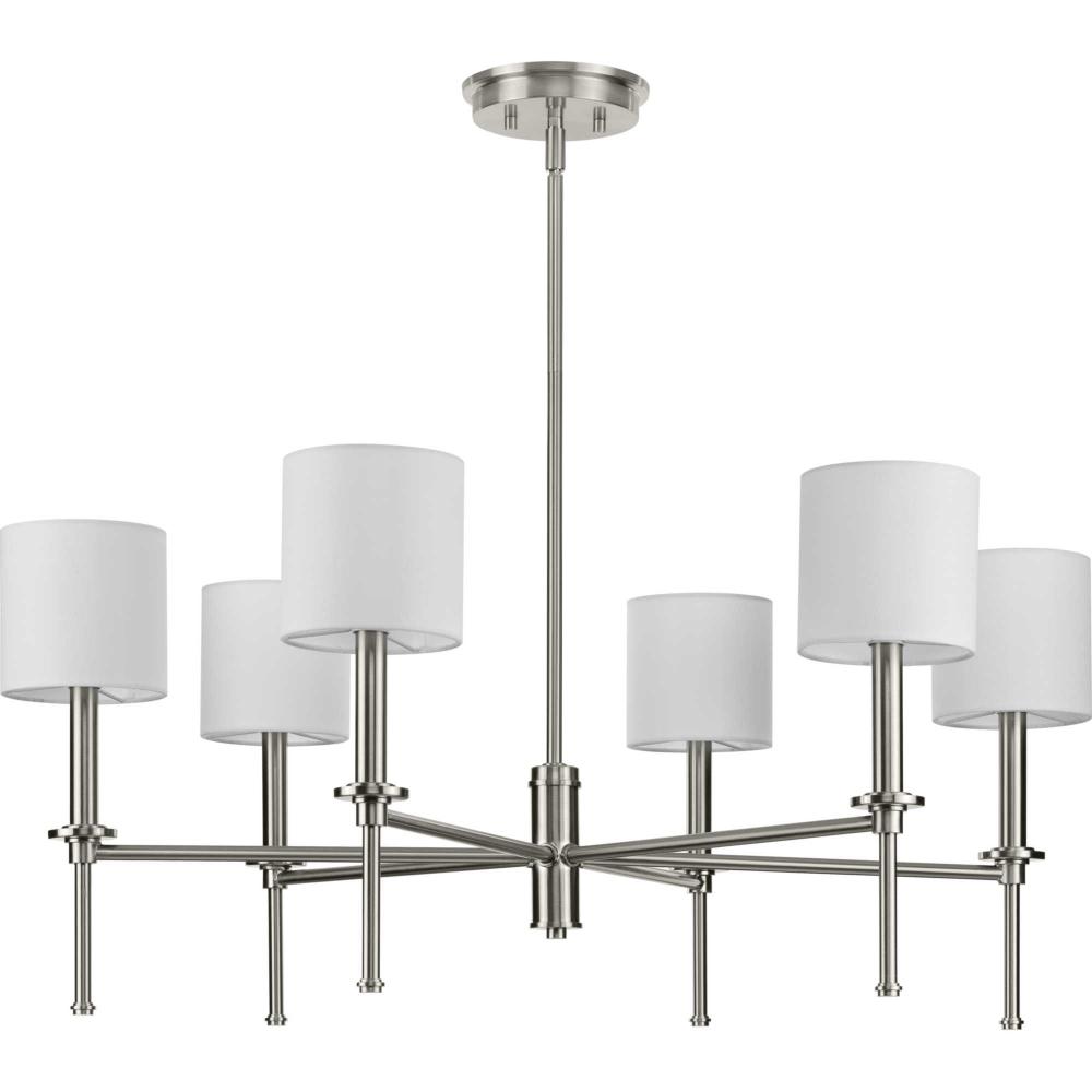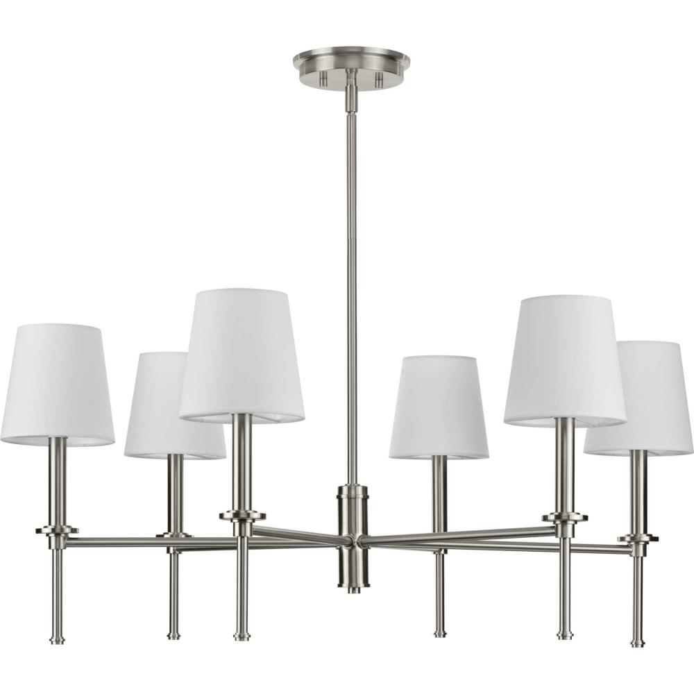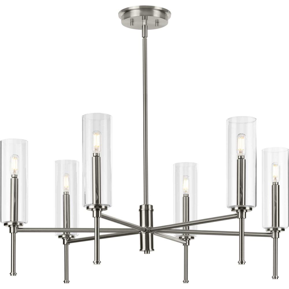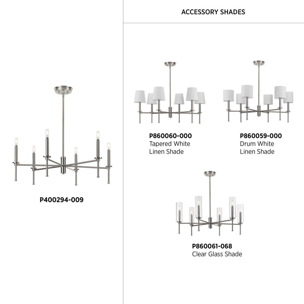 Elara has a clean contemporary design that works across many decor styles. The chandelier features a slender, chic form with stylized finials inspired by a chess pawn for a classically modern look. Select tapered or fabric drum shades, or clear cylindrical glass shades to customize the design and create the perfect amount of even illumination.