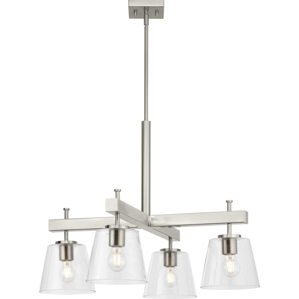 Embrace modern urban style with the Saffert chandelier. Clear glass shades punctuate a stoic, beam-style frame. Substantial scale and a bold form make a statement in dining rooms, kitchens and bar areas. Saffert is the perfect choice for new traditional, industrial and luxe interiors.