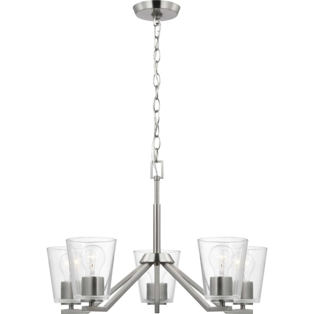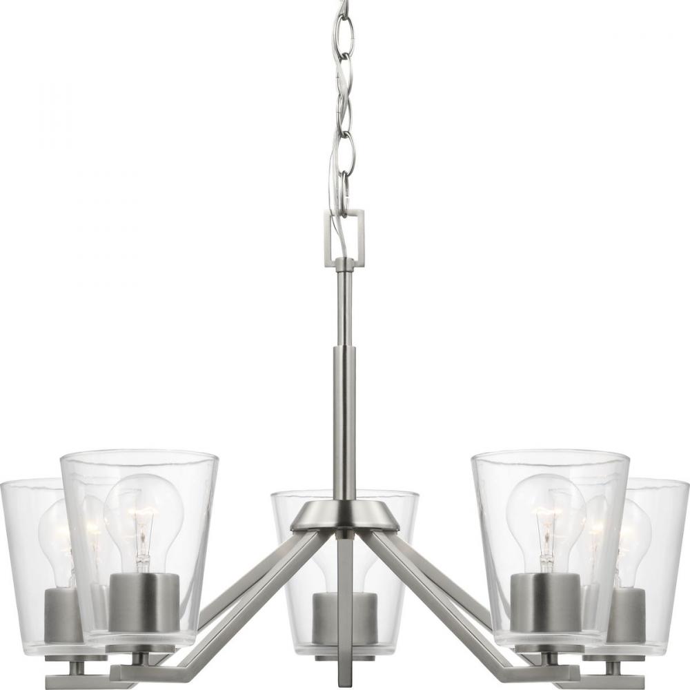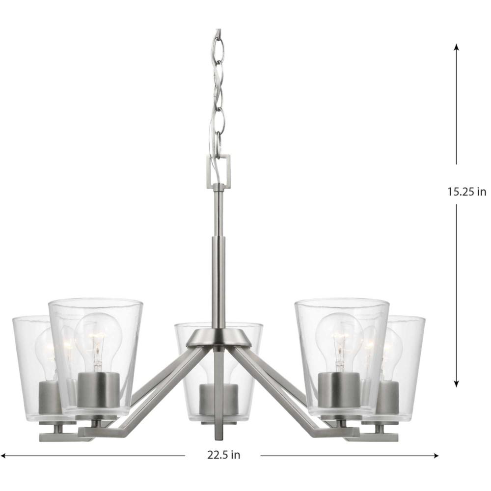 Elegantly extended, the Vertex chandelier is composed of angular forms to create a bold design that perfectly complements dining rooms and living rooms in modern interiors. Its distinctive silhouette is coated in a soft brushed nickel finish. A clear glass shade offers bright illumination to spaces below. Customize the chandelier's hanging height to your ceiling using the Included 48 in. of chain for a variety of ceiling heights and sloped ceilings.