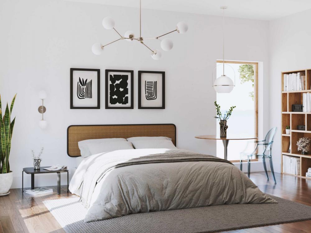 The chandelier complements dining rooms, great rooms and bedrooms with its etched opal glass globes and bold linear lines