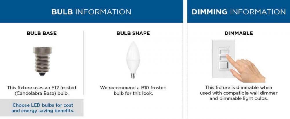 Uses (6) 60-watt candelabra base bulbs or LED equivalent, that is sold separately, and dimmable when used in conjunction with a dimmable bulb