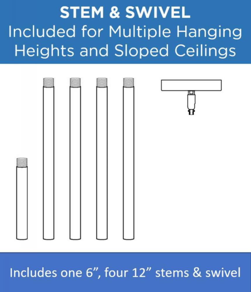 Includes one 6", four 12" stems and a 90-degree swivel for a variety of mounting types and sloped ceiling