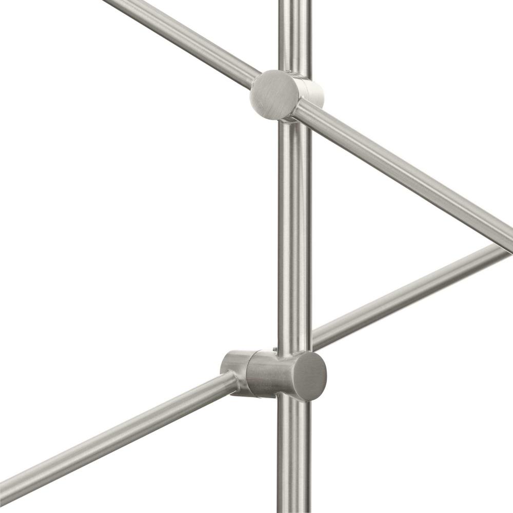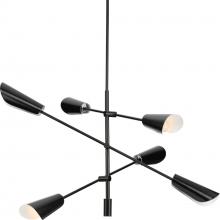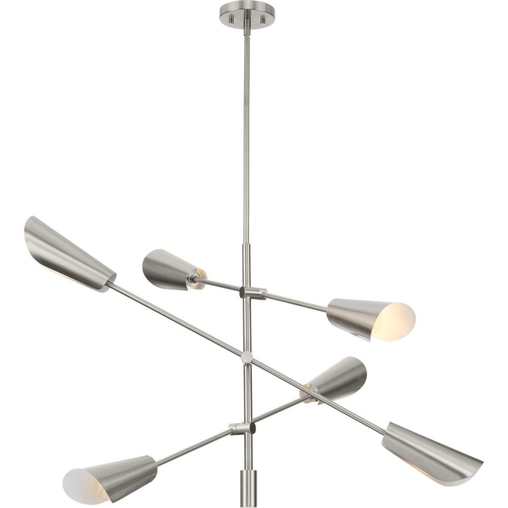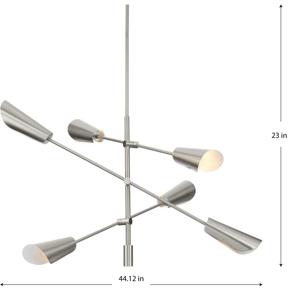 Cornett trumpets its arrival on the scene with a blending of timeless modern design. The Six-Light Chandelier features dynamic angles finished in Brushed Nickel, offering a dramatic counterpoint to the softly sculpted curves of the matching metal reflector shades.Light is directed out and downwards from its unique, curved construction.