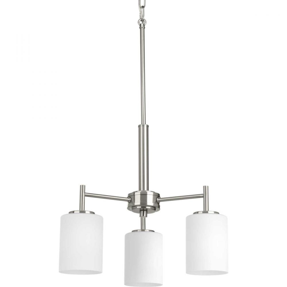 Three-light chandelier from the Replay Collection features a linear form that provides a pleasingly elegant accent to your home. A sleek, metallic finish is complemented by white glass diffusers for a clean, modern silhouette. Brushed Nickel finish.