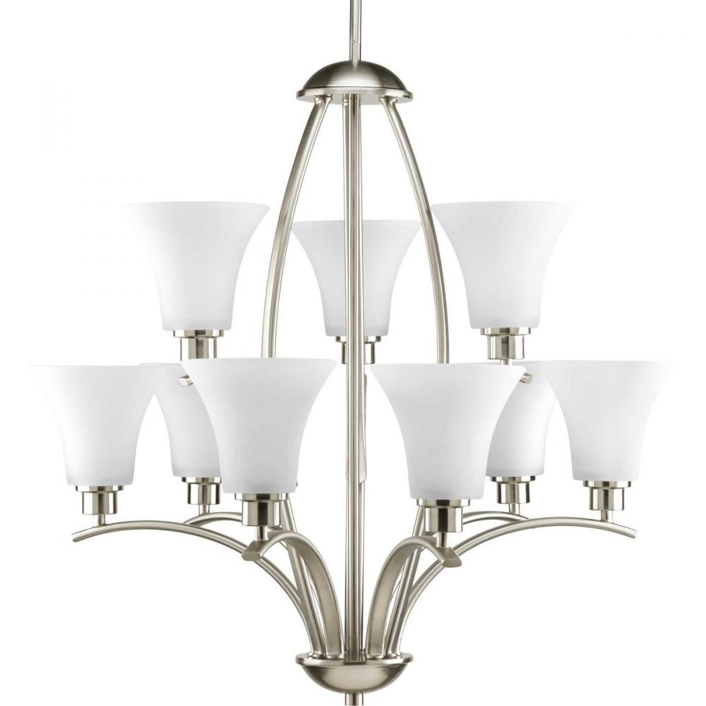 Gleeful simplicity defines this nine-light, two-tier chandelier from the Joy Collection. Refreshing and fashionable arcing forms of Brushed Nickel metal arms enhance the etched white fluted glass. Coordinating fixtures from this collection let you decorate an entire home with confidence and style. Unique stem-hung construction carries the clean line all the way to the ceiling and, for sloped ceilings, six feet of 9 gauge chain is provided to allow the fixture to hang straight and level.