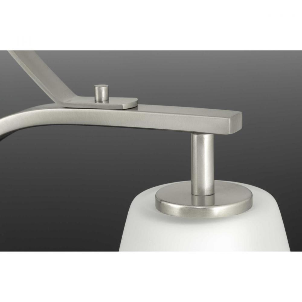 Brushed Nickel finish.;Sweeping arcs frame tapered etched shades.;Glass shades large in scale.;Contemporary design.;Includes one 6", four 12" stems and 6 Links of chain.