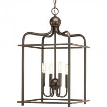 Assembly Hall provides a formal and classic open caged pendant for a variety of traditional and transitional interiors. This Design Series collection features arching frames that are great in scale and surround a candelabra cluster with matching candles. Four-Light Brushed Nickel Foyer Pendant.