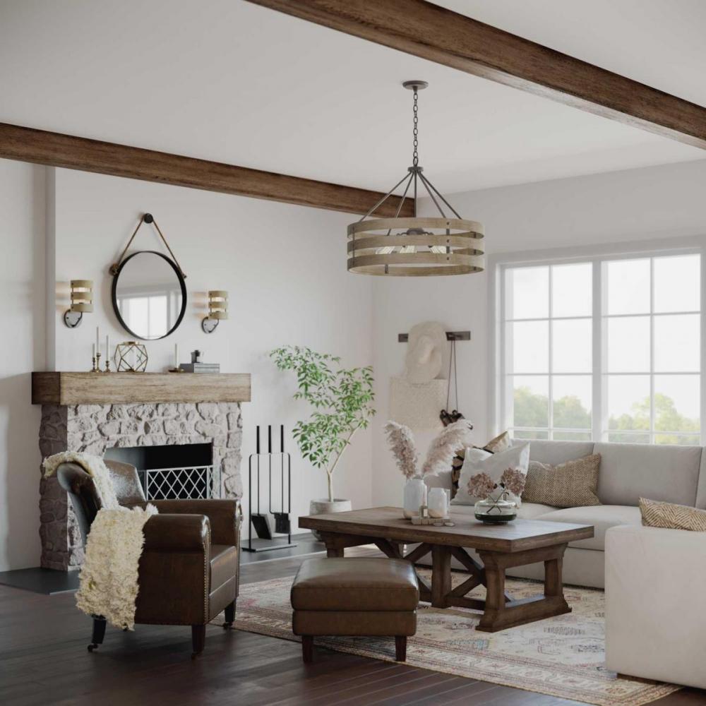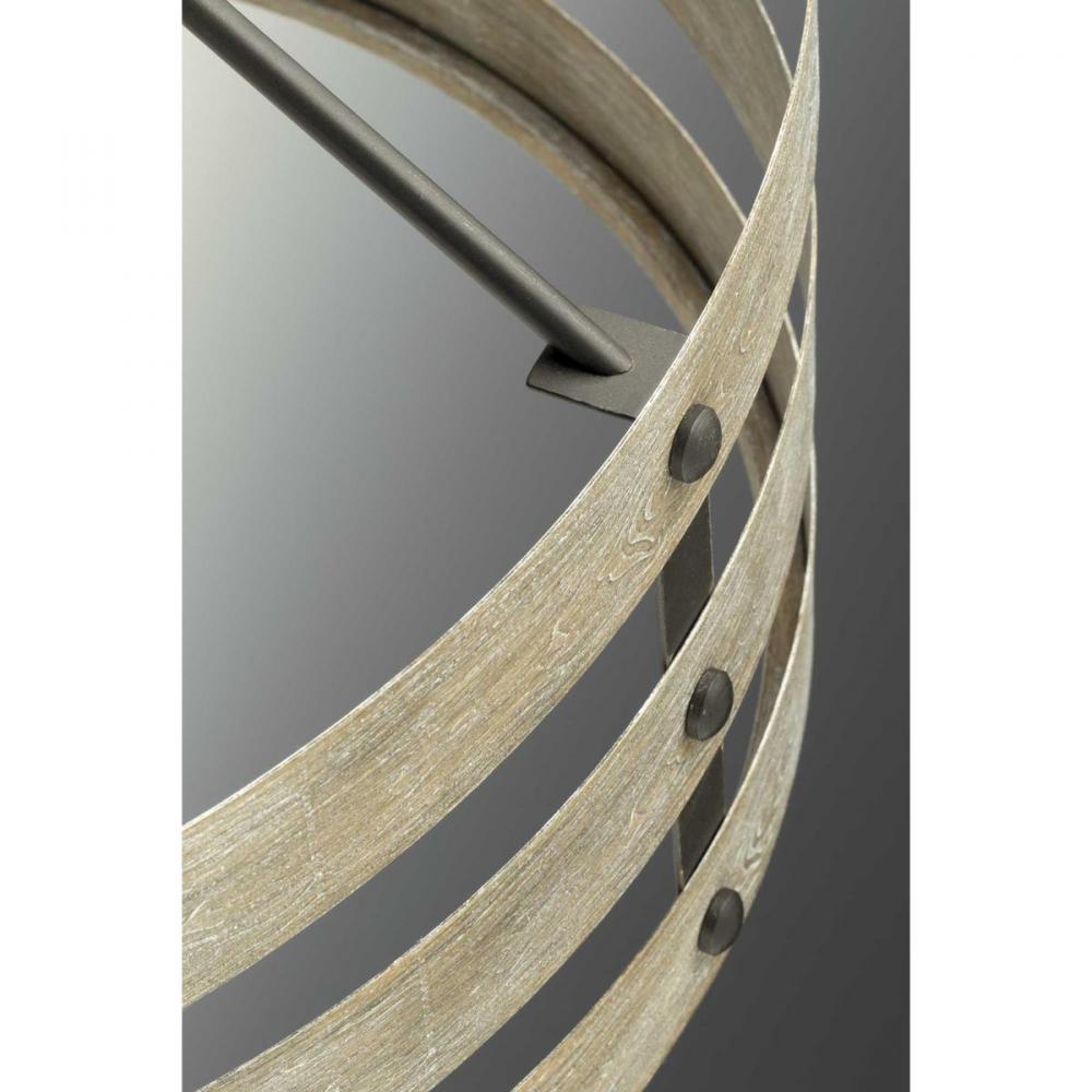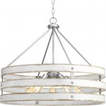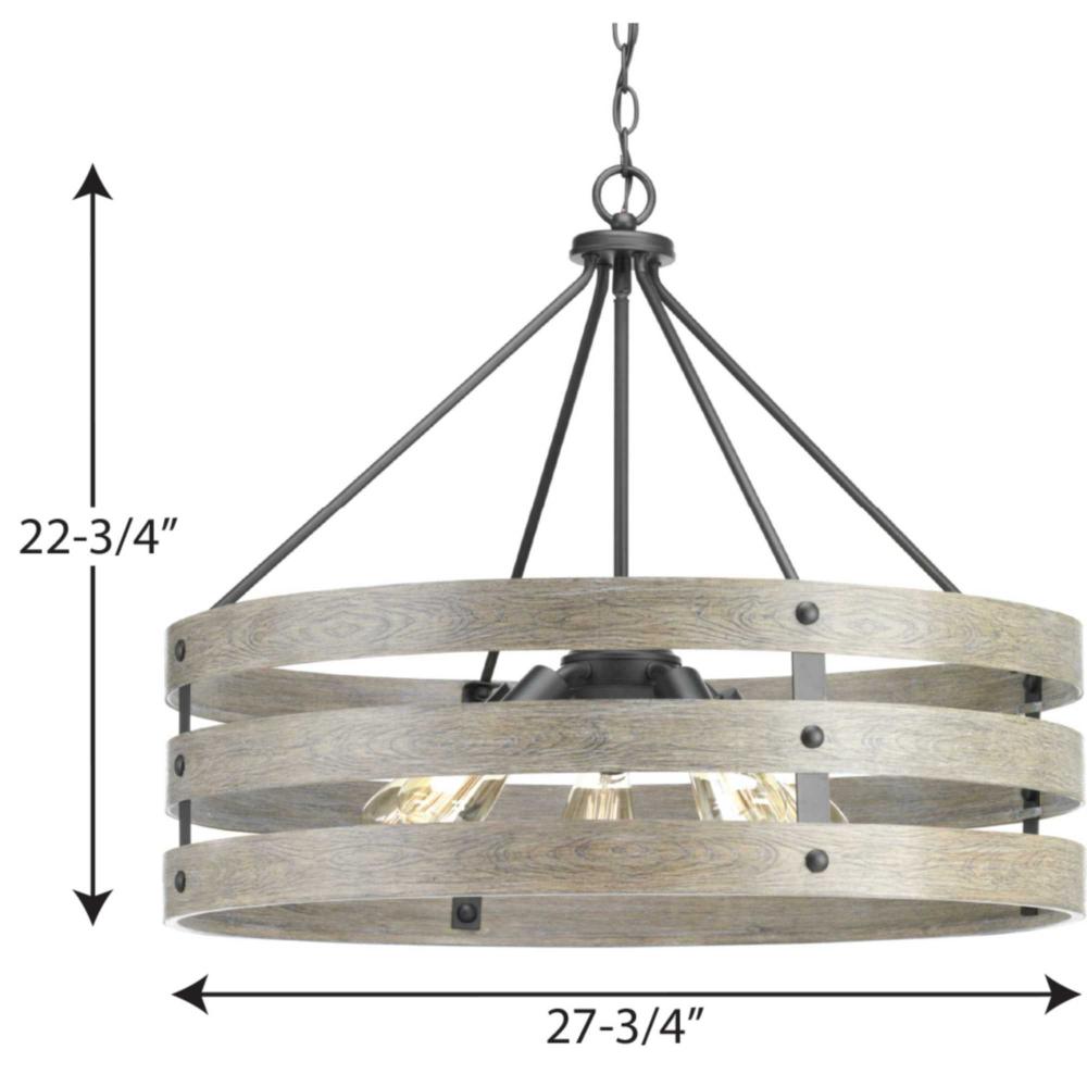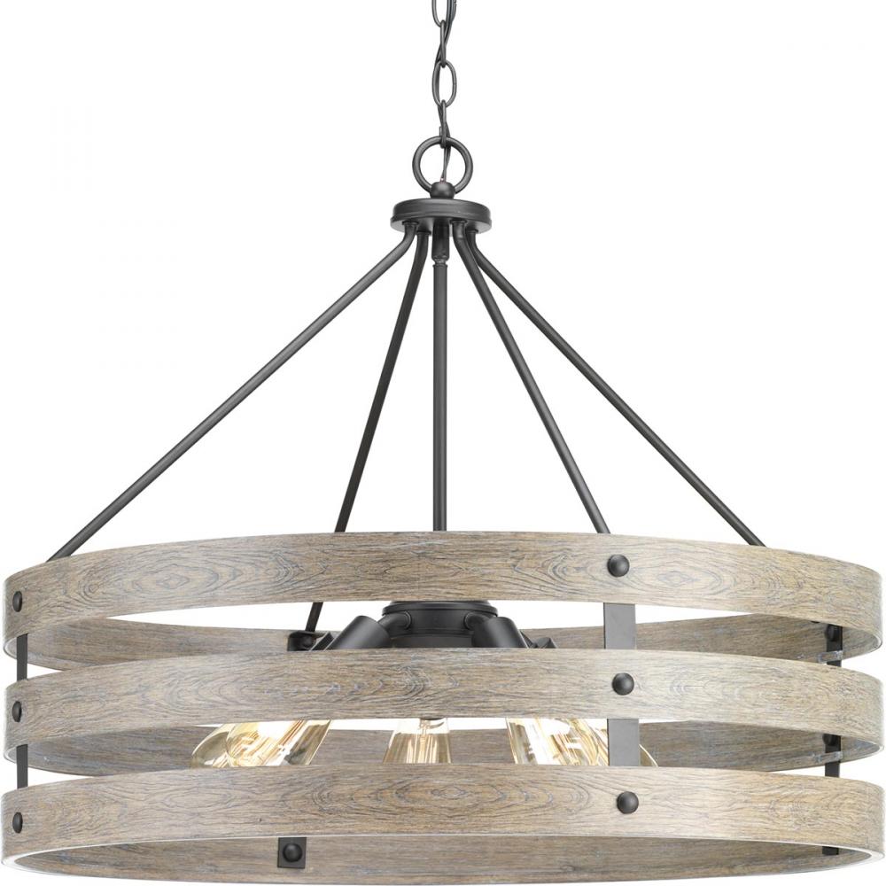 Three circular bands wrap together to create an open design for Gulliver five-light pendant. Dual toned frame color combinations of Graphite with weathered gray accents. A hand painted wood grained texture complements Rustic and Modern Farmhouse home decor, as well as Urban Industrial and Coastal interior settings.