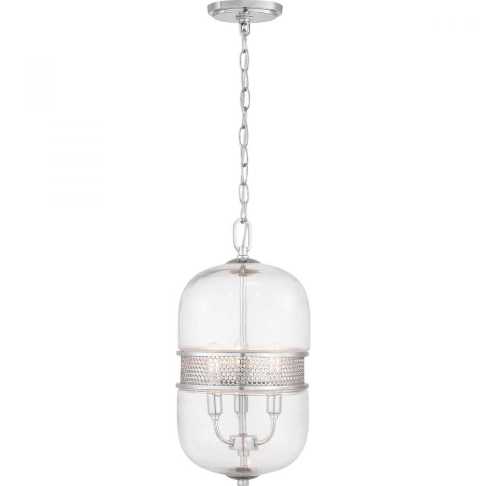 A band of Polished Chrome filigree in an interlocking hexagonal design cinches an oblong glass globe;A three-light pendant features a candelabra cluster that glows from within, casting dancing shadows through the graphic Polished Chrome band;Suitable for f