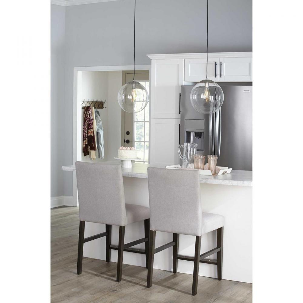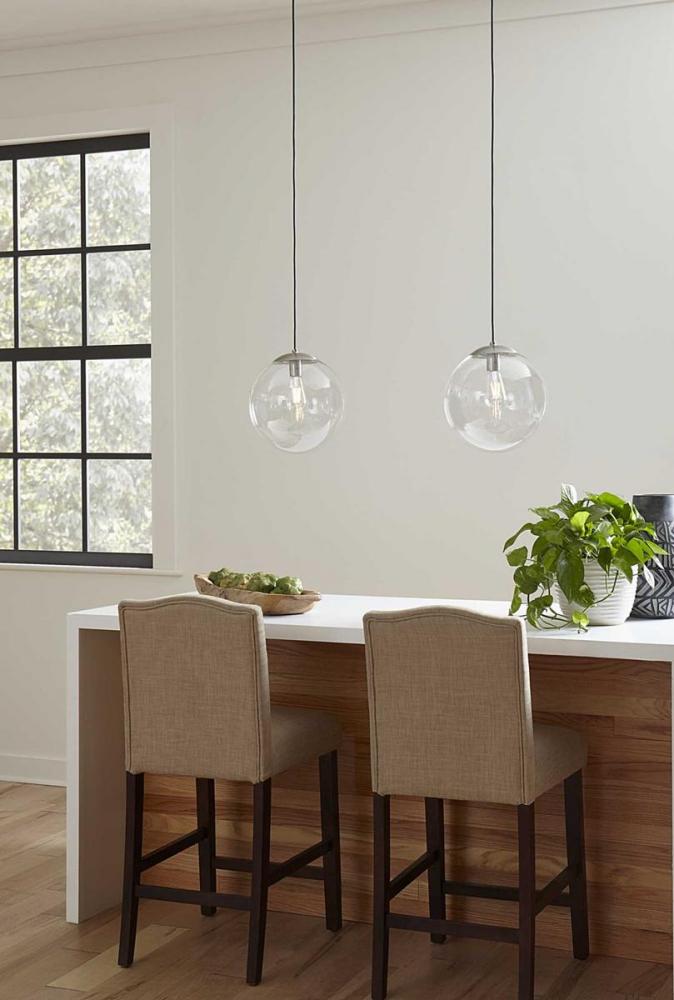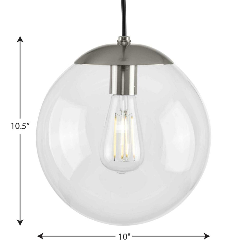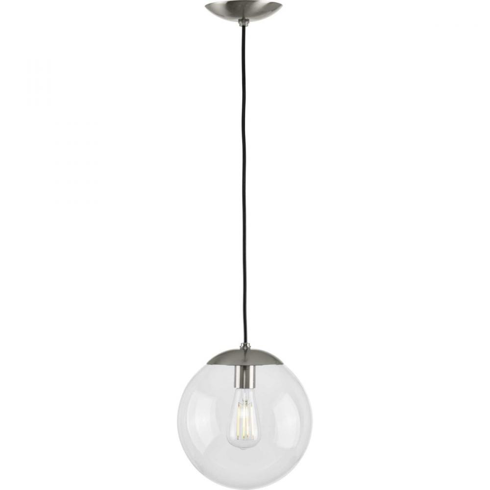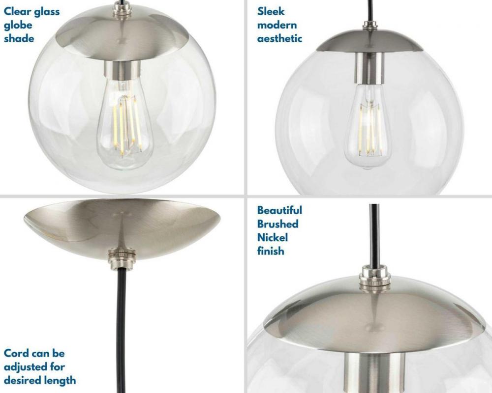 Embrace a statement-making lighting design with the Atwell Collection 1-Light Glass Globe Brushed Nickel Modern Pendant Light. A light source glows from within a clear glass globe shade that fosters a soft and enduring design. The metal cap and light base are coated in a beautiful brushed nickel finish that accentuates the hanging light's modern aesthetic.