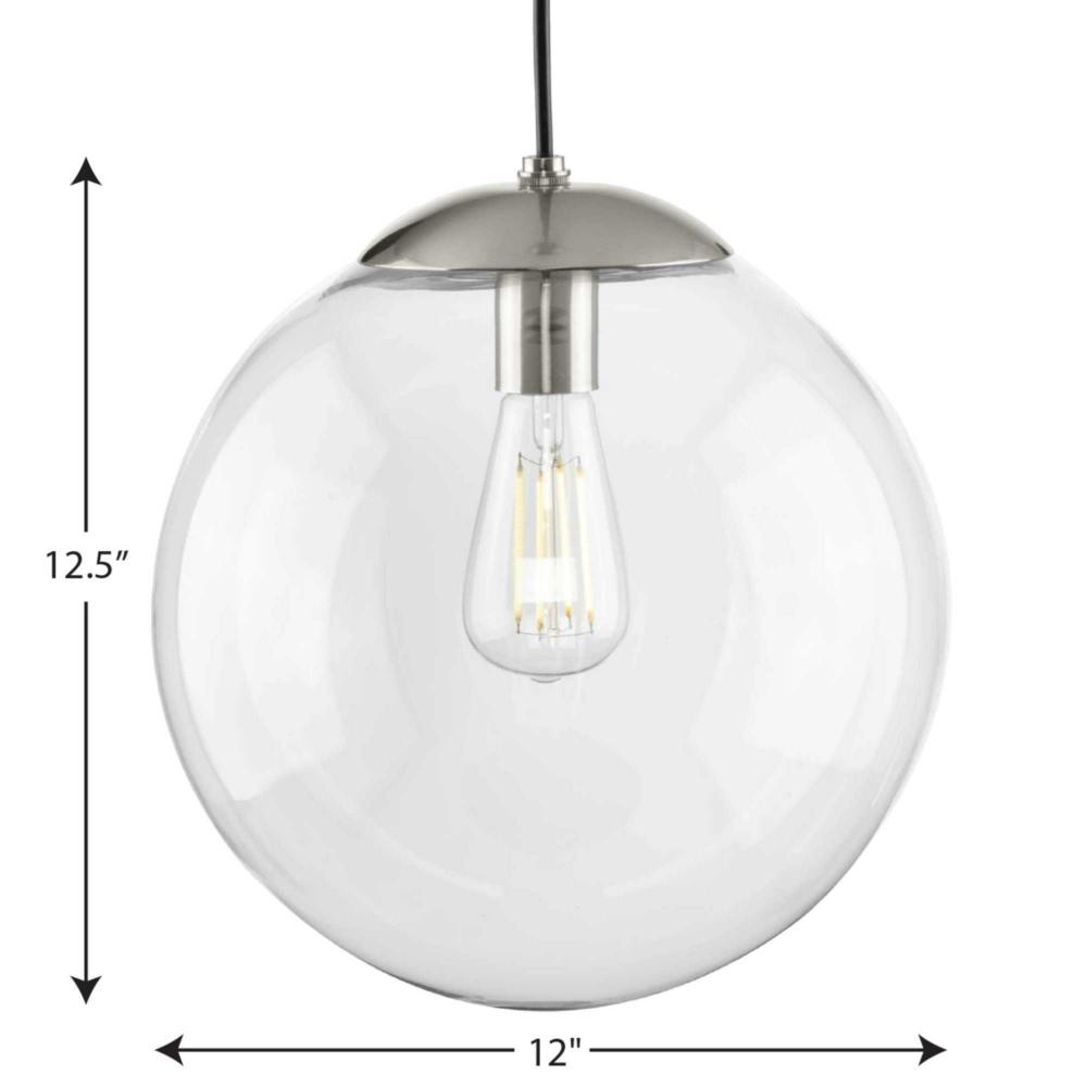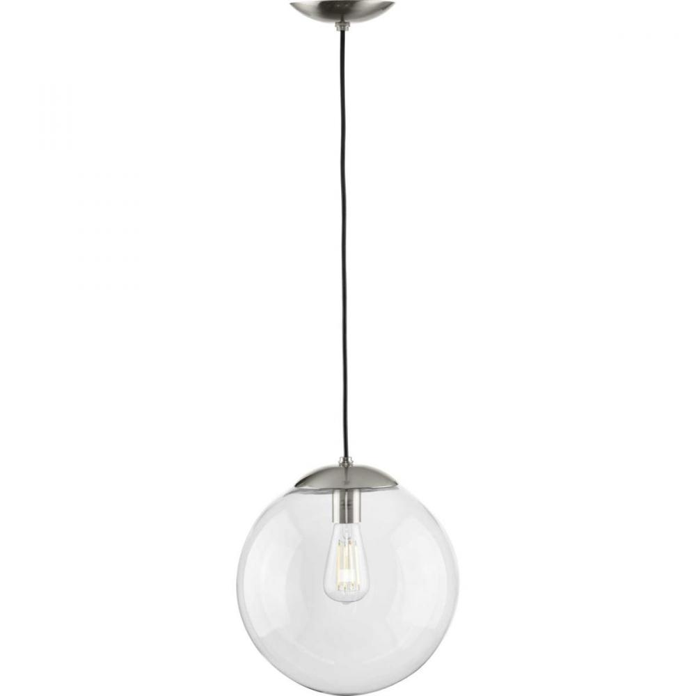 Embrace a statement-making lighting design with the Atwell Collection 1-Light Glass Globe Brushed Nickel Modern Pendant Light. A light source glows from within a clear glass globe shade that fosters a soft and ending design. The metal cap and light base are coated in a beautiful brushed nickel finish that accentuates the hanging light's modern aesthetic.