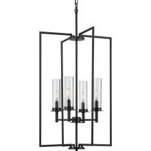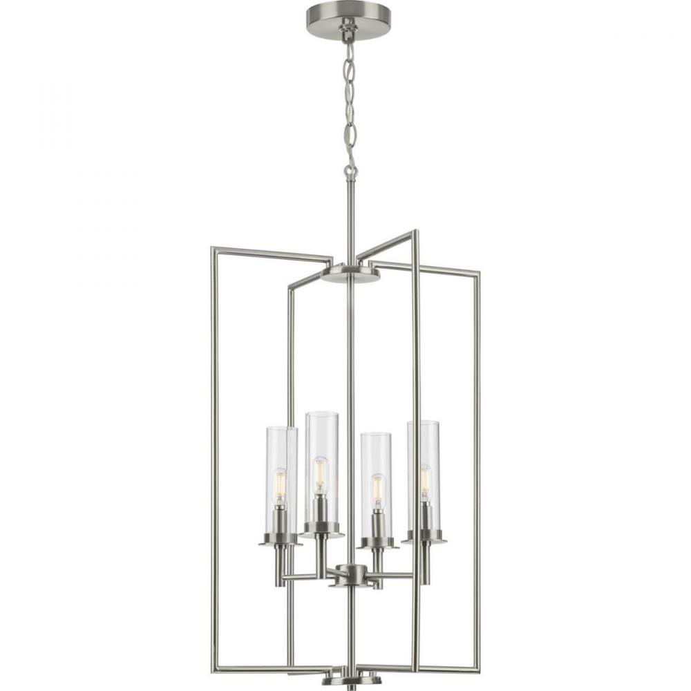 Balance the best of modern and traditional with the Kellwyn Collection 4-Light Brushed Nickel Clear Glass Transitional Foyer Pendant Light. The classic cage design is composed of crisp, clean lines coated in a beautiful brushed nickel finish for a touch of luxury. Light sources glow within clear, cylindrical glass shades for luxurious illumination.