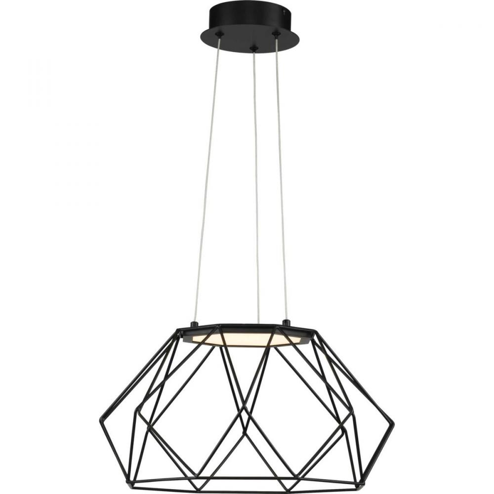 Take a contemporary space to a new level with the Geodesic LED Collection Matte Black LED Mid-Century Modern Medium Pendant Hanging Light. The open diamond-patterned frame is coated in a classic matte black finish and is suspended from cables attached to a round ceiling plate. A uniform, continuous disc of light glows through the airy frame.