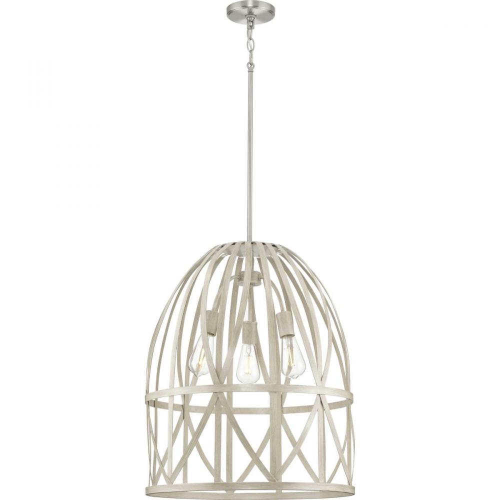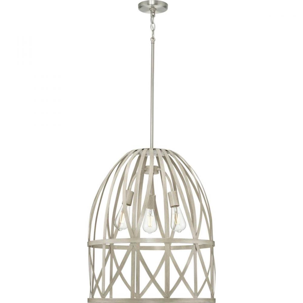Add an eye-catching lighting design to your home décor with the Chastain Collection. The pendant's airy frame draws upon the handcrafted artistry of basket-weaving to offer a graceful silhouette. The artisanal style is enhanced by a bleached oak distressed faux wood finish accented by a brushed nickel stem.