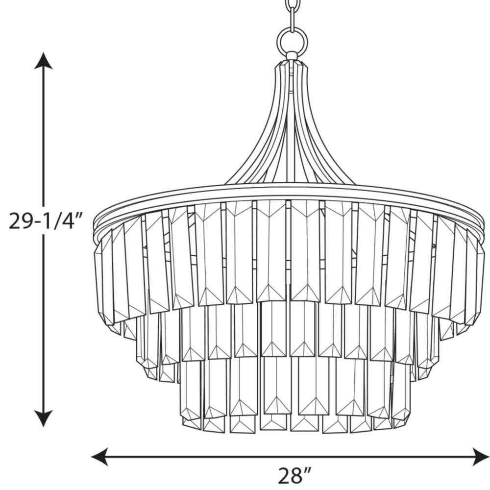 Glimmer fits the definition of livable luxury with elements that sparkle to create an instant statement within the home. Prismatic glass six-light round pendant is supported by an architecturally- styled frame in Silver Ridge finish. The cascade of faceted linear glass deliver a sleek silhouette to any room.