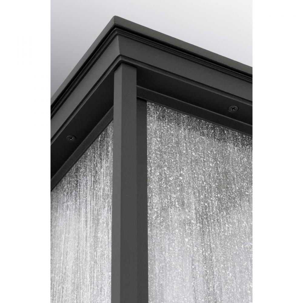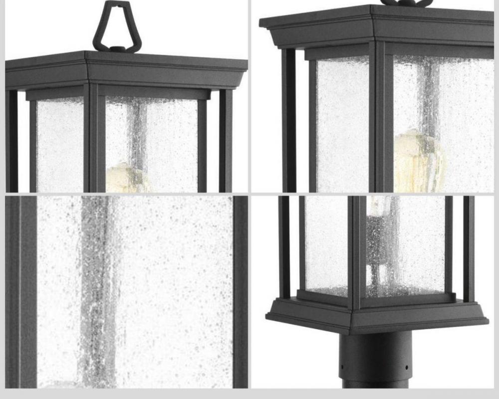 Features a Craftsman-inspired silhouette;An outdoor lantern with an elongated frame.;Frame is finished with clear seeded glass;Black finish.;Fits 3" post. (order separately.).