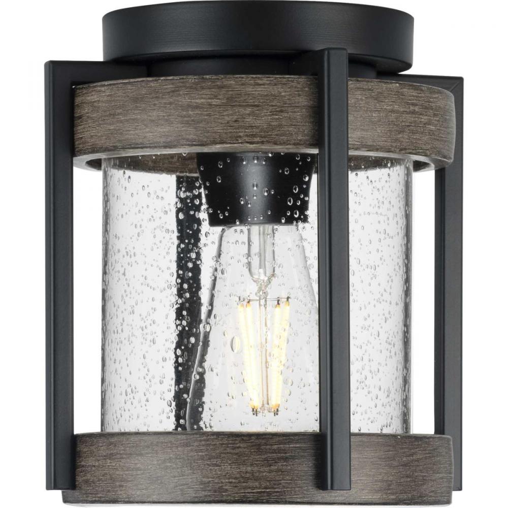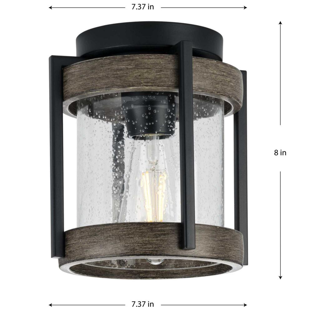 Blend rustic style with modern elegance with the Whitmire Collection. Wood-tone bands accent a clear seeded glass shade for beautiful illumination. A classic matte black frame and circular ceiling plate complete the outdoor flush mount's charming design.
