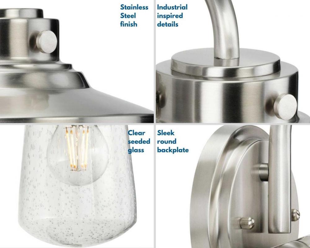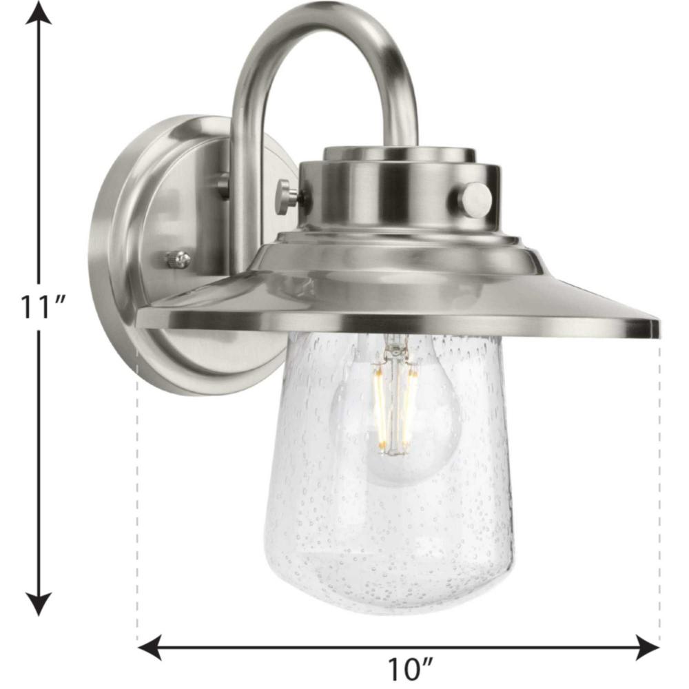 Welcome family and friends home with the Tremont Collection 1-Light Clear Seeded Glass Stainless Steel Industrial Outdoor Medium Wall Lantern Light. A light source glows from within a clear seeded glass shade reminiscent of raindrops on a window after a summer thunderstorm for a touch of rustic character. The wall light's round backplate, curved arm, and round shade decorated with mechanical fittings are coated in a stainless steel finish to accentuate the design's industrial aesthetic.