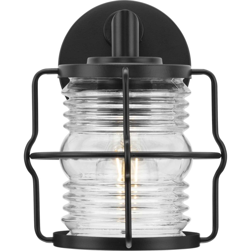 Redefine modern coastal style with the Keegan Collection, whose breezy silhouette takes a cue from a lighthouse. A ribbed clear glass, Fresnel-style shade is nestled within a protective wire frame finished in crisp matte black, creating a beacon in the night.Its nautical style is ideal for indoor or outdoor use in coastal and urban industrial patios, porches, laundry and mud rooms, in bathrooms and other areas where a unique wall light is desired.It is cULus wet location listed for use where water may be present, with a one-year warranty to guarantee your complete satisfaction. This versatile fixture includes 60 in. of chain for a variety of ceiling heights and can be used on a sloped ceilings. Progress Lighting products are designed for exceptional quality, reliability, and functionality.