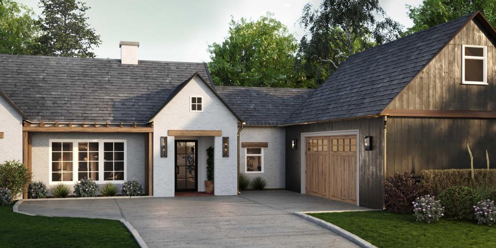 Unique angular lines perfectly frame the soft light source from within, ideal for Modern Farmhouse and Transitional exteriors